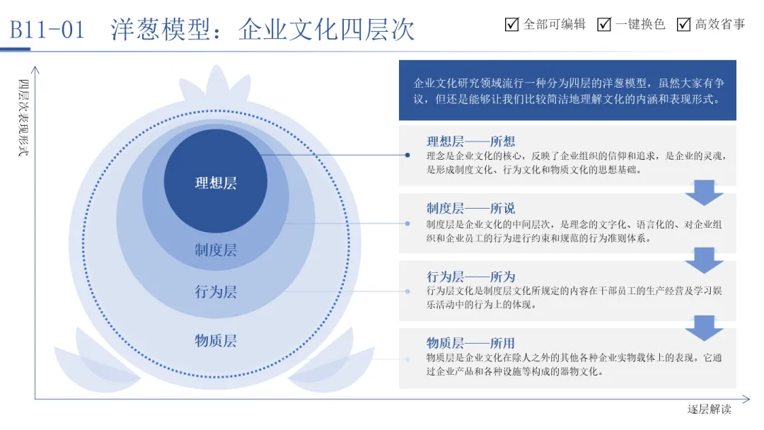洋葱模型如同剥开一颗洋葱,由表及里地展示事物的层次结构。用于分析企业文化时,它从最外层的“表象”(如行为、仪式),深入到“表达的价值”(如战略、目标),再到“基本的价值观念”,最终触及最核心的“关于现实的本质认知”。这个模型提醒我们,真正影响组织行为的,是深藏于内的、被视为理所当然的核心假设,改变文化必须触及内核。