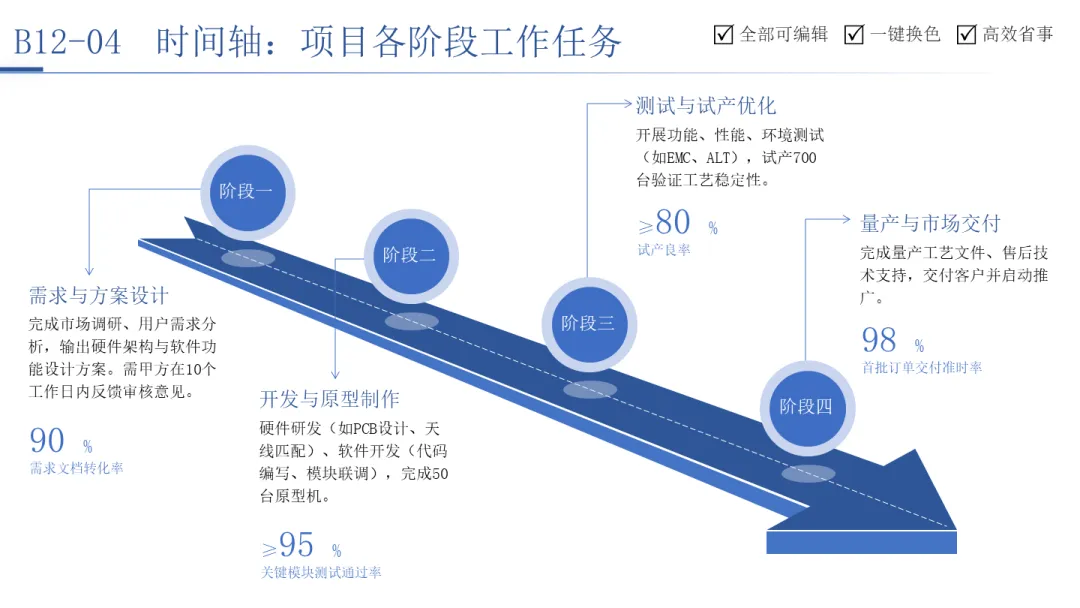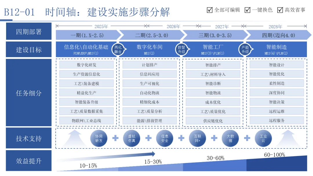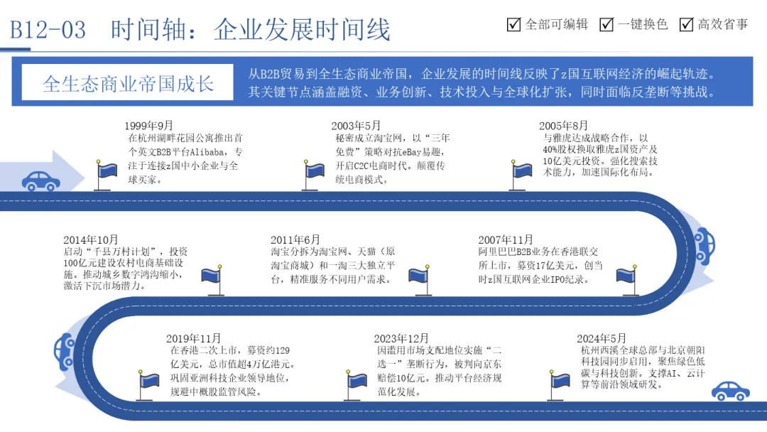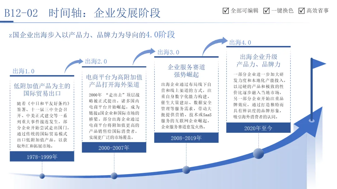 时间轴则是呈现发展历程、阶段规划与项目进度的线性工具。无论是企业从信息化到智能制造的“四期建设”路线图,还是中国企业出海从1.0到4.0的演进阶段,抑或是某个互联网巨头从创业到构建商业帝国的关键里程碑,时间轴都能将复杂的历史或规划,梳理为一条清晰可见、有里程碑、有因果联系的叙事线。它让战略蓝图变得可预期,让发展历程变得可追溯。