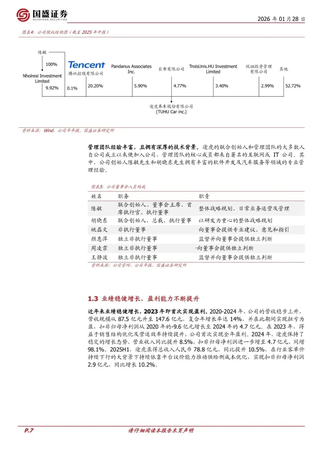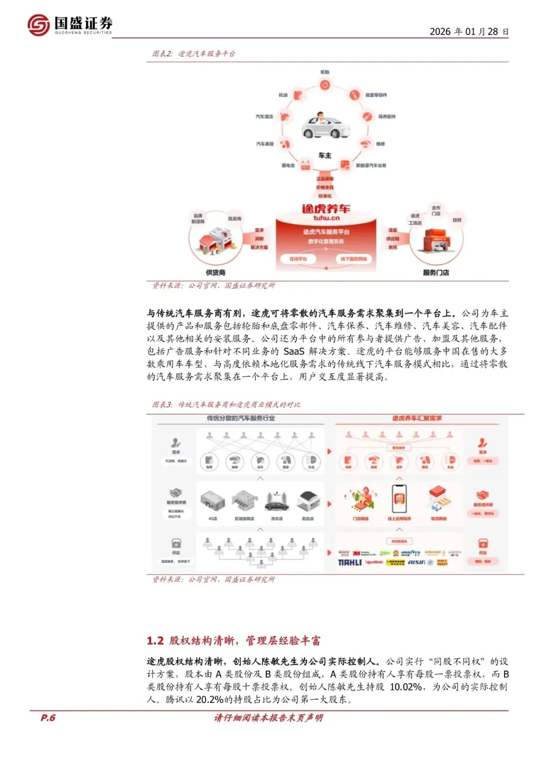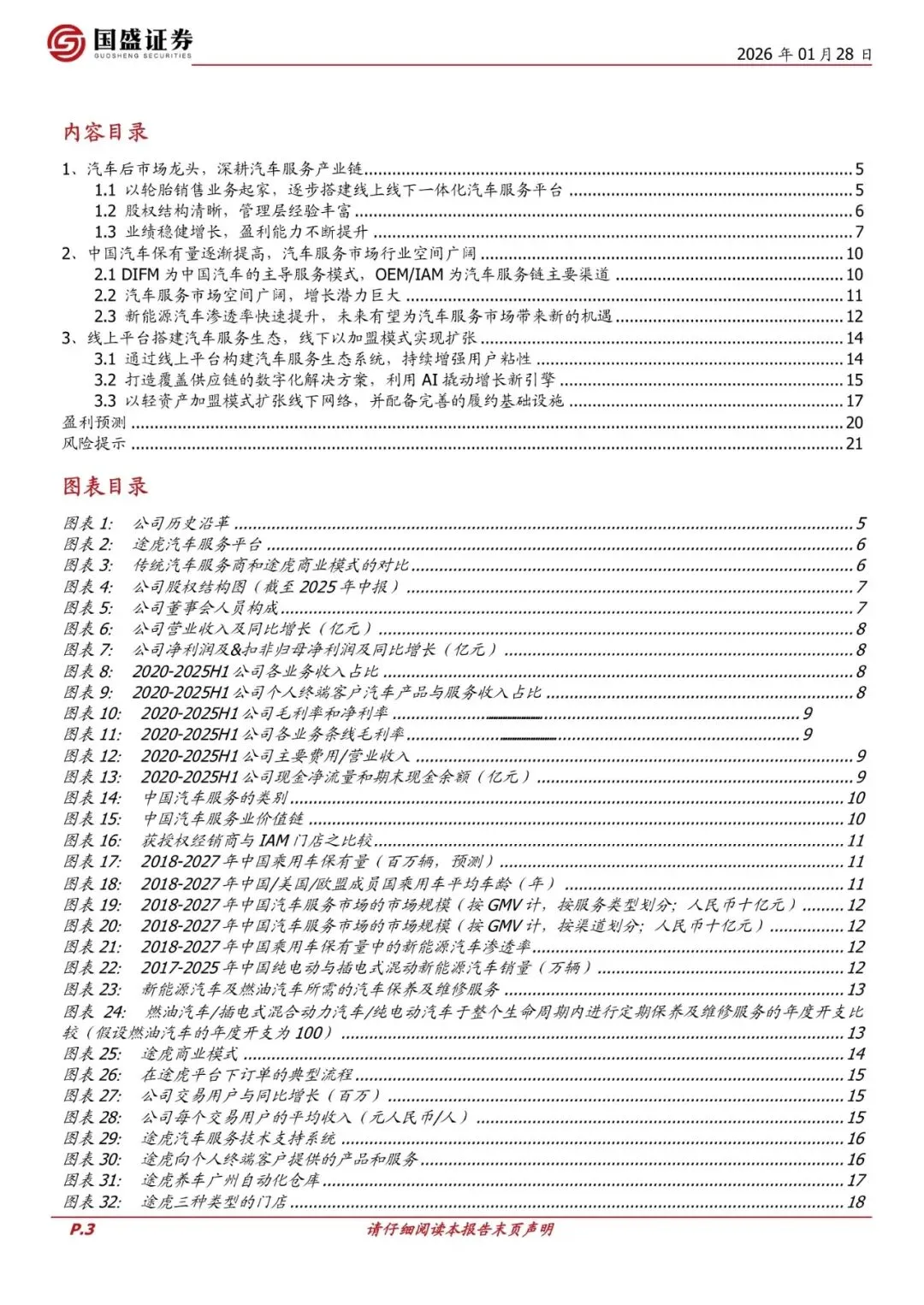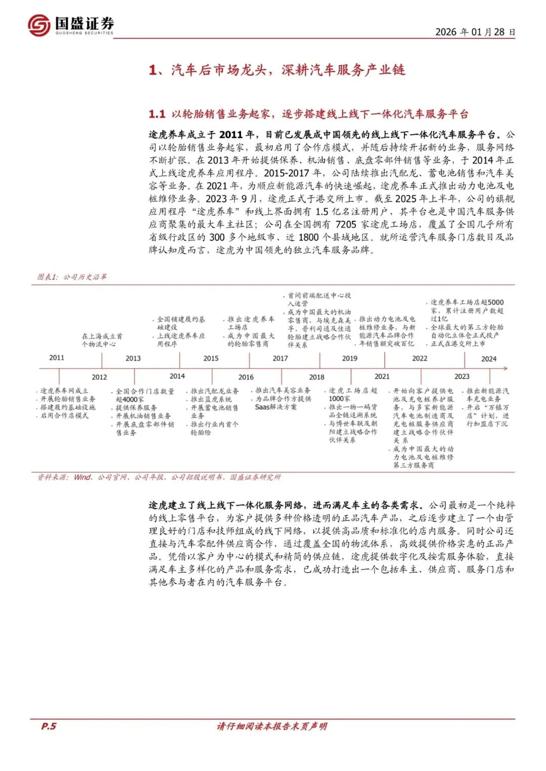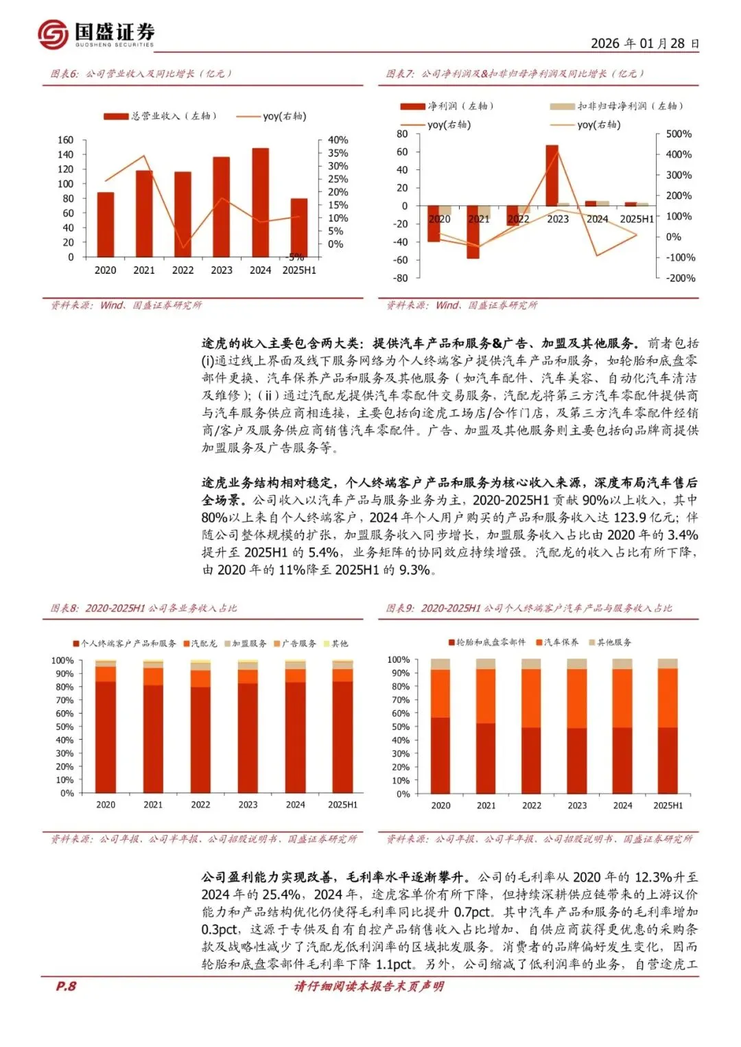 途虎养车作为中国领先的线上线下一体化汽车服务平台,自2011年成立以来,已构建起覆盖全国的服务网络与完善的生态体系。财务层面,公司已实现盈利突破,营收与净利润保持稳健增长态势,毛利率稳步提升,现金流状况良好。随着线上用户流量增加和线下门店网络持续下沉、高毛利业务占比提升及运营效率进一步改善,公司业绩增长的持续性与确定性较强,龙头地位稳固。