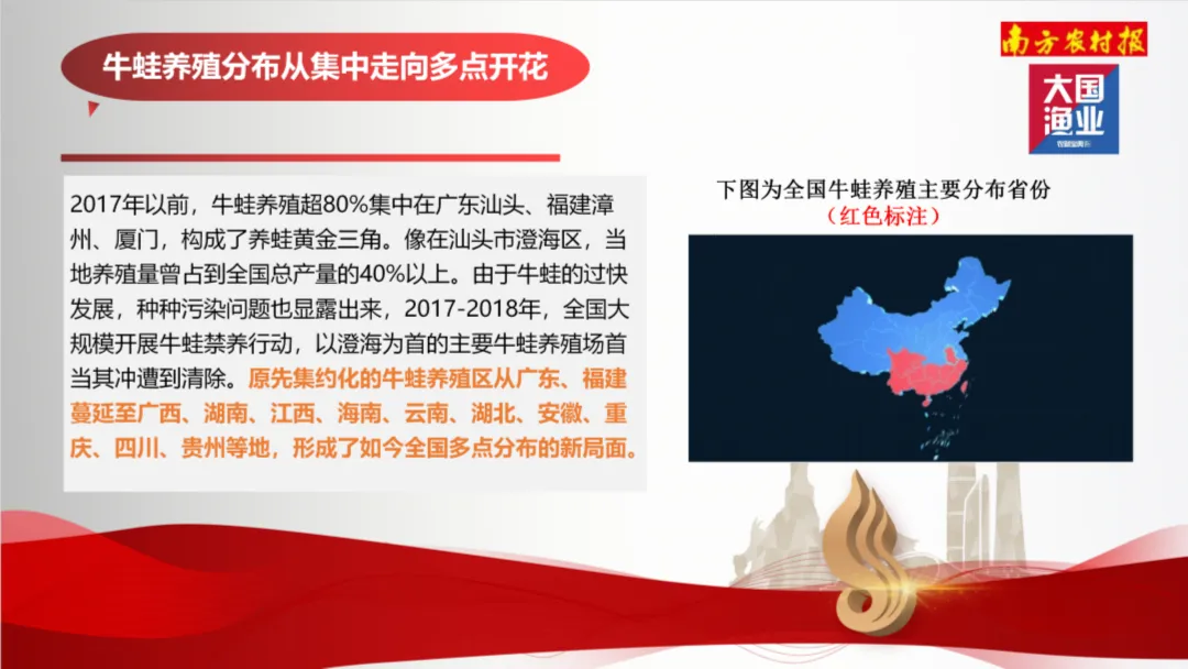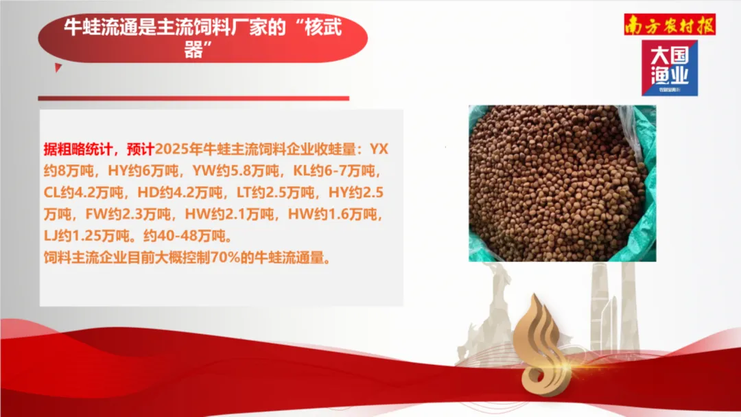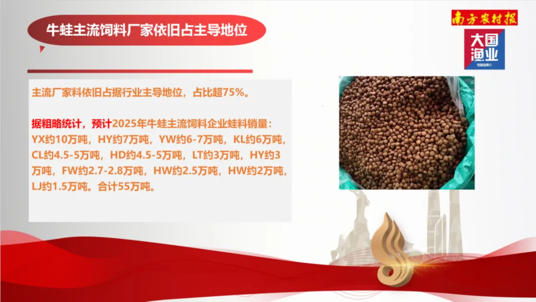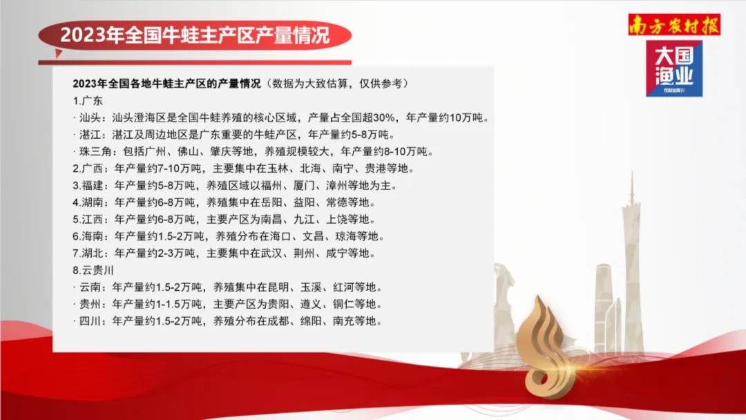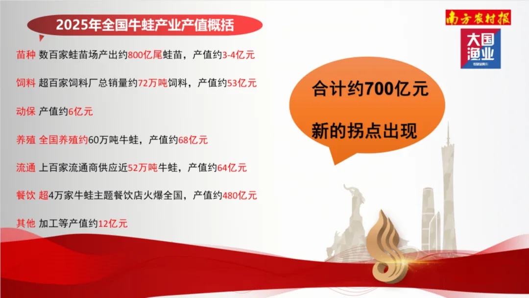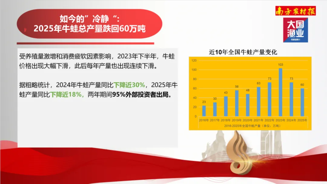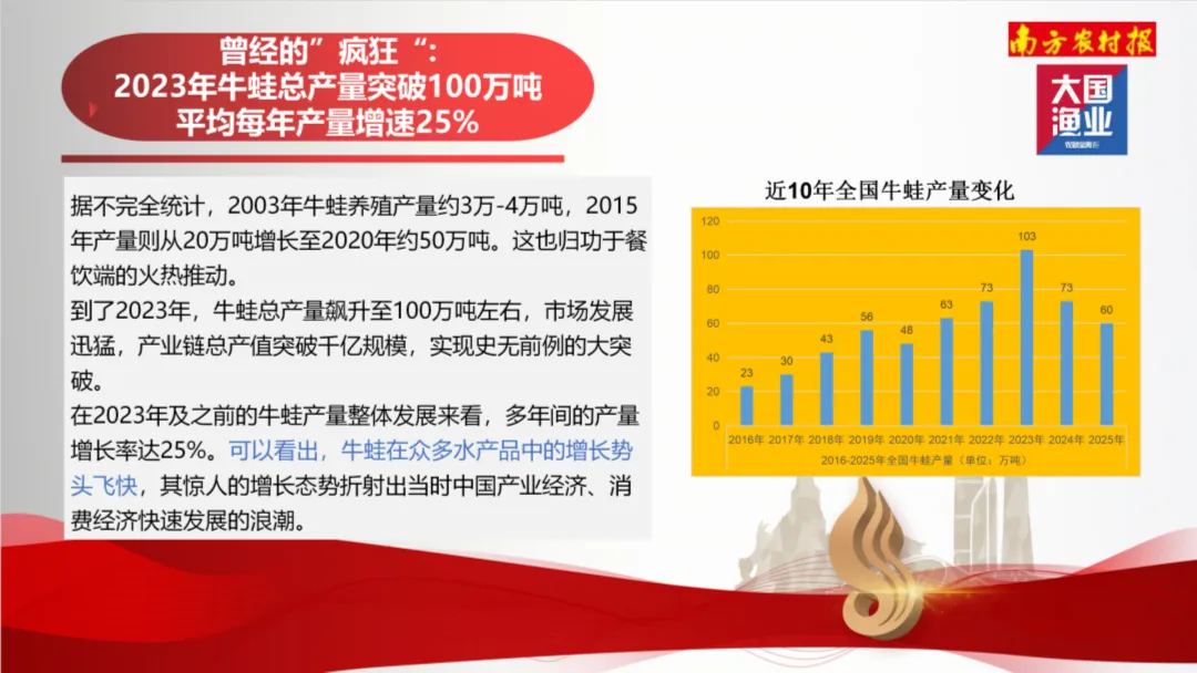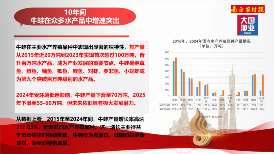 牛蛙产业近年来发展迅速,已成为水产品中增长最快的品种之一。2025年,全国牛蛙产业整体产值达到约700亿元,涵盖苗种、饲料、养殖、流通、餐饮及加工等多个环节。其中,苗种环节年产量达800亿尾,产值约3至4亿元;饲料环节总销量72万吨,产值约53亿元;养殖环节年产量约60万吨,产值约68亿元;流通环节供应量近52万吨,产值约64亿元;餐饮环节以超过4万家主题店为支撑,产值达480亿元,成为产业链中占比最大的部分。动保和加工等其他环节产值合计约12亿元。从产业结构看,第一产业(养殖)产值约195亿元,占28%;第二产业(加工)产值约12亿元,占2%;第三产业(消费)产值约480亿元,占70%。这表明牛蛙产业高度依赖消费端拉动,市场潜力巨大。过去十年间,牛蛙产量从2015年的近20万吨增长至2023年的超100万吨,成为第九个突破百万吨级别的水产品。尽管2024年受环境因素影响,产量下滑至70万吨,2025年进一步降至55至60万吨,但其整体增长趋势依然明显。2015年至2024年间,牛蛙产量增长高达317.65%,远超其他水产品种,主要得益于市场需求的持续扩大。牛蛙凭借高蛋白、低脂肪的健康特性,深受消费者欢迎,未来仍有较大发展空间。