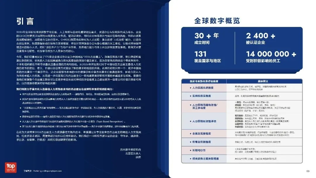 2026年全球职场加速数字化转型,AI与自动化重塑岗位需求,灵活办公、技能迭代成为常态,新质生产力推动产业升级,跨界融合与本土化创新能力愈发关键。白皮书围绕人才策略、领导力、组织变革、数字化人力资源、雇主品牌、人才发展等核心维度,系统呈现以人为本的卓越人力实践。这些实践既聚焦当下职场痛点,又贴合行业趋势,为组织提升战略敏捷性、构建人才护城河、打造优质职场生态提供了可借鉴的路径,助力企业在复杂环境中实现可持续发展。