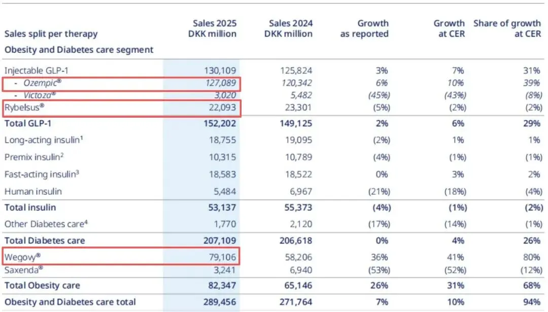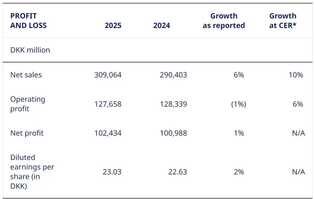 2月4日,全球代谢疾病领域龙头诺和诺德正式发布2025年全年财报,一份“喜忧参半”的成绩单引发医药圈广泛关注。据诺和诺德官方财报显示,全年销售额达3090.64亿丹麦克朗(固定汇率计增长10%),共计489亿美元,同比增长6%,净利润1024.34亿丹麦克朗,合计162亿美元,同比增长1%。其中,最引人瞩目的核心亮点,仍是“明星药物”司美格鲁肽,其全系产品全年销售额约为2282.88亿丹麦克朗,合计361.38亿美元,远超此前市场预估,继续以绝对优势领跑GLP-1赛道,撑起诺和诺德的业绩半壁江山,暂列全球最畅销药物TOP1。