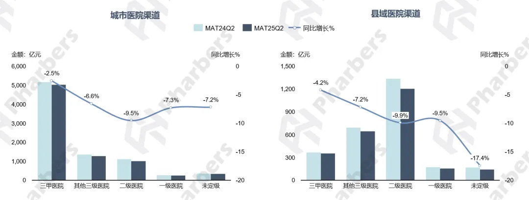根据法伯全渠道数据显示,我国县域医院渠道MAT25Q2药品市场规模增速低于城市医院渠道(-8.6% vs -4.4%)(图1)。与城市医院渠道相比,县域医院渠道药品平均价格降幅较大,药品销售数量增速则相对较高。