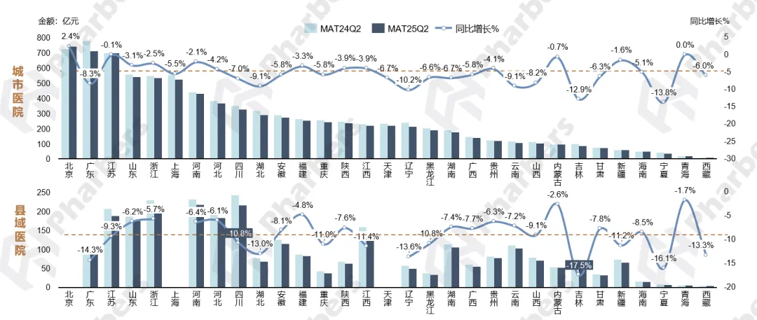 图3-MAT25Q2医院渠道市场省份表现(城市医院 vs 县域医院)