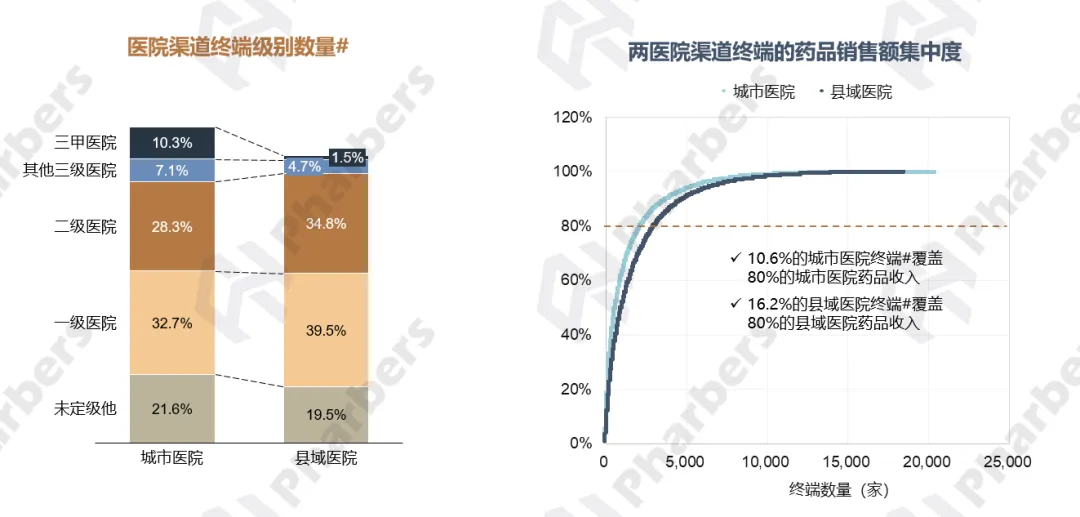 此外,根据法伯终端数据库显示,城市医院渠道的三级医院数量占比为17.4%,而县域医院渠道仅为6.2%。从终端药品销售额集中度来看,16.2%的县域医院终端数量覆盖80%的县域医院药品收入,集中度低于城市医院渠道(图4)。