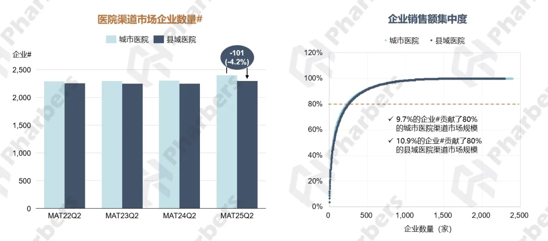 企业方面,根据法伯院内渠道数据显示,县域医院渠道参与药品销售的企业数量低于城市医院渠道,两类终端的企业销售额集中度相近(图5)。关注在两类医院终端排名靠前的企业,法伯数据显示,MAT25Q2共有16家企业同时在城市和县域医院渠道排名前20位,包括阿斯利康、恒瑞医药、齐鲁制药、辉瑞、诺华等,而罗氏集团、华润双鹤等企业则仅在单一医院渠道排名较高。