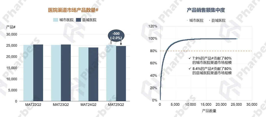 产品方面,县域医院渠道参与竞争的产品数量少于城市医院,集中度与城市医院差异不大(图6)。