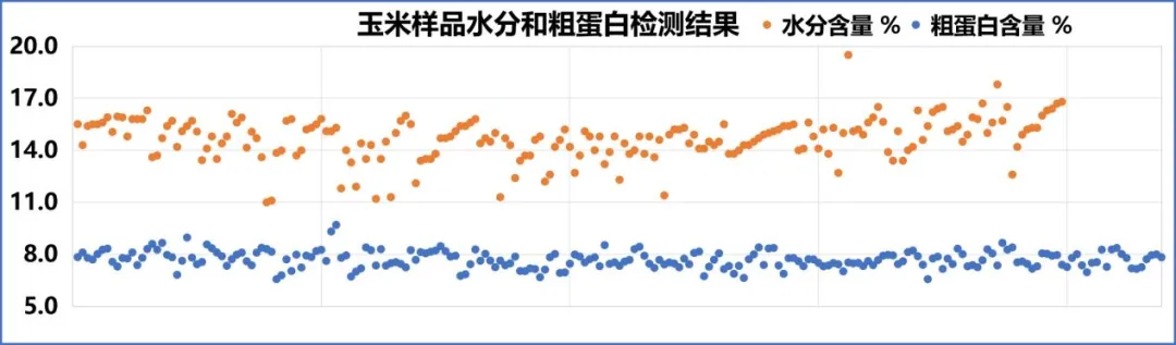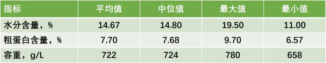 玉米样品主要检测了水分含量、粗蛋白含量、容重和霉菌毒素含量。从数据来看,不同养殖场送检的玉米水分含量、粗蛋白含量和容重检测结果差异较大。玉米水分含量与采收季节天气、烘干程度、储存方式以及储存时间等因素有关,粗蛋白含量和容重与玉米的品种及产地有一定的关系。