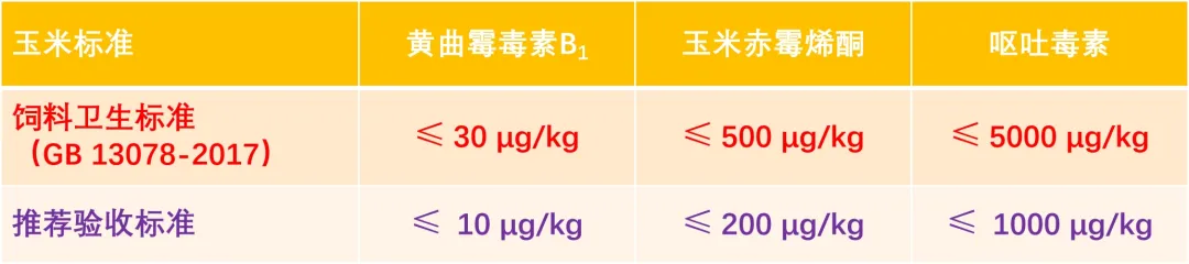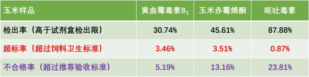 玉米样品霉菌毒素检测结果及参考标准见下表,参考《饲料卫生标准》(GB 13078-2017),黄曲霉毒素B1和玉米赤霉烯酮检测超标的样品占3.5%左右,呕吐毒素检测超标的样品占0.87%;如果参考更加严格的“推荐验收标准”,黄曲霉毒素B1超标样品占5.19%,玉米赤霉烯酮超标样品占13.16%,呕吐毒素超标样品占23.81%。
