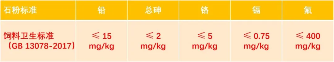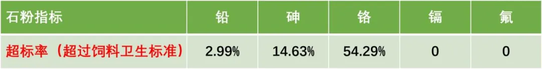 石粉样品重金属含量检测结果及参考标准如下表,参考《饲料卫生标准》(GB 13078-2017),铬含量超标的样品占54.29%,砷超标的样品占14.63%,铅超标的样品占2.99%,镉和氟含量超标的样品占比为零。