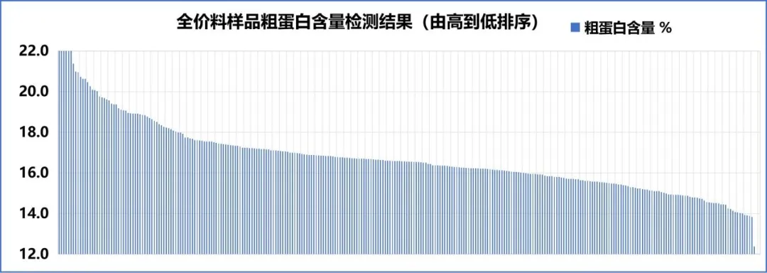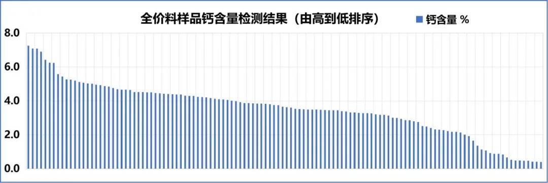 全价料样品主要检测粗蛋白含量、钙含量、磷含量和霉菌毒素含量等指标。下图将全价料样品的粗蛋白和钙含量检测结果由高到低做了排序,从检测结果来看,部分全价料样品的粗蛋白和钙含量检测结果出现偏高或偏低的情况(开口料样品除外),表明养殖场送检的全价料样品可能存在混合不均匀或分级现象。