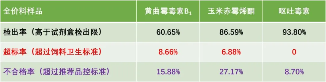 全价料样品霉菌毒素含量检测结果及参考标准如下表,参考《饲料卫生标准》(GB 13078-2017),黄曲霉毒素B1和玉米赤霉烯酮含量超标的样品占比略高,呕吐毒素含量超标的样品占比为零,与玉米样品的检测结果相一致。如果参考更加严格的“推荐品控标准”,三种毒素检测不合格的样品占比升高,黄曲霉毒素B1含量超标的样品占15.88%,玉米赤霉烯酮含量超标的样品占比高达27.17%,呕吐毒素含量超标的样品占8.70%。