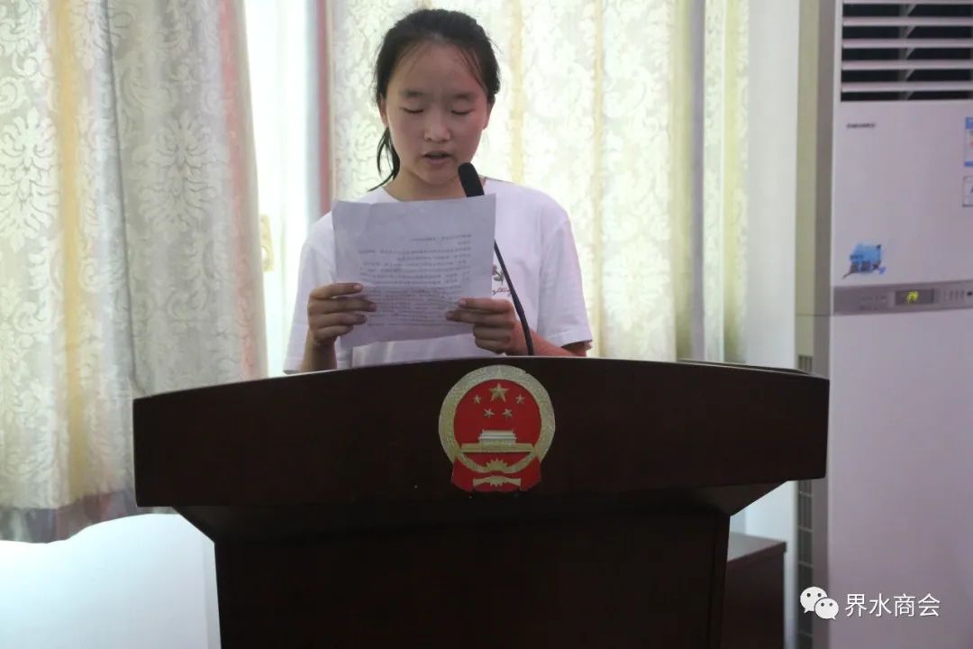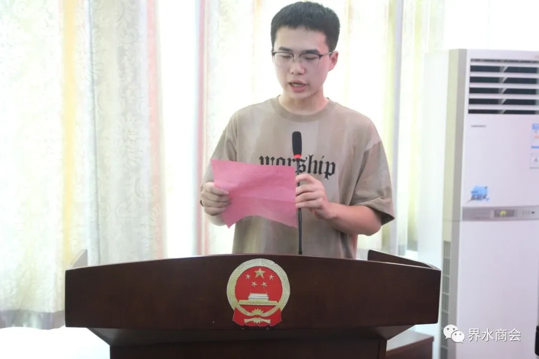 被哈尔滨工业大学录取的罗子安作为学生代表发言。他表示,代表所有受助同学向家乡党委政府和商会表示感谢,在未来的大学生活中,定当秉持刻苦奋斗的精神,不忘初心、牢记使命、奋勇争先,不负党和国家的希望,为社会发展贡献力量。