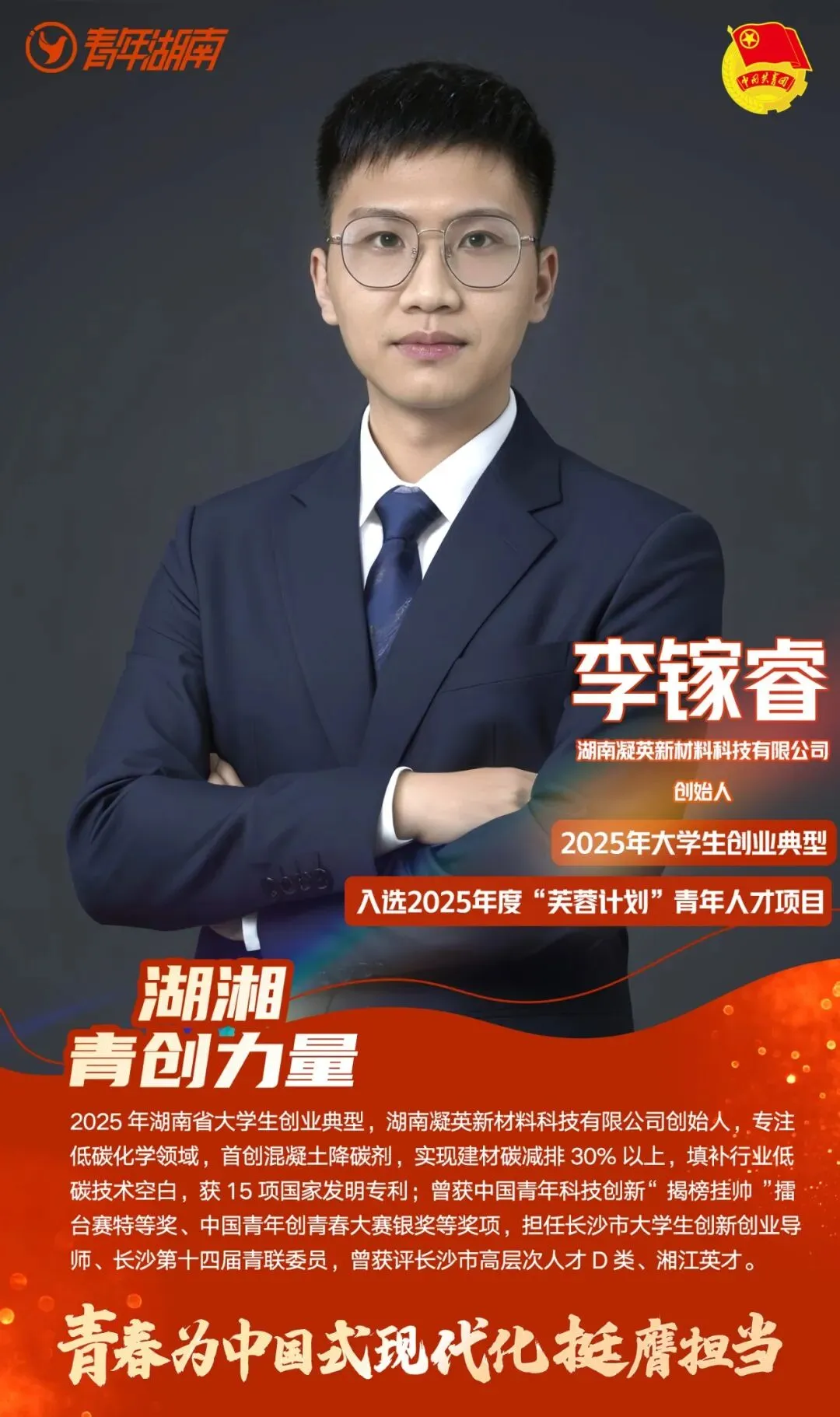 7年后,李镓睿入选2025年度“芙蓉计划”青年人才项目。他创立的凝英科技估值突破2亿元,研发的低碳剂让水泥用量直降50%,每年帮建材企业节省数亿元成本。从实验室里的“异想天开”到年产值千万的行业新势力,这个26岁的在读博士,用一场“建材低碳革命”诠释了何为“敢为人先”。