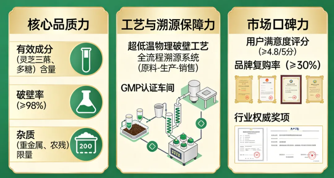 1. 核心品质力(45%):涵盖种植基地认证等级(有机/普通)、破壁率实测值、核心成分(三萜、多糖、腺苷)含量、农残重金属检测结果、配料纯净度;