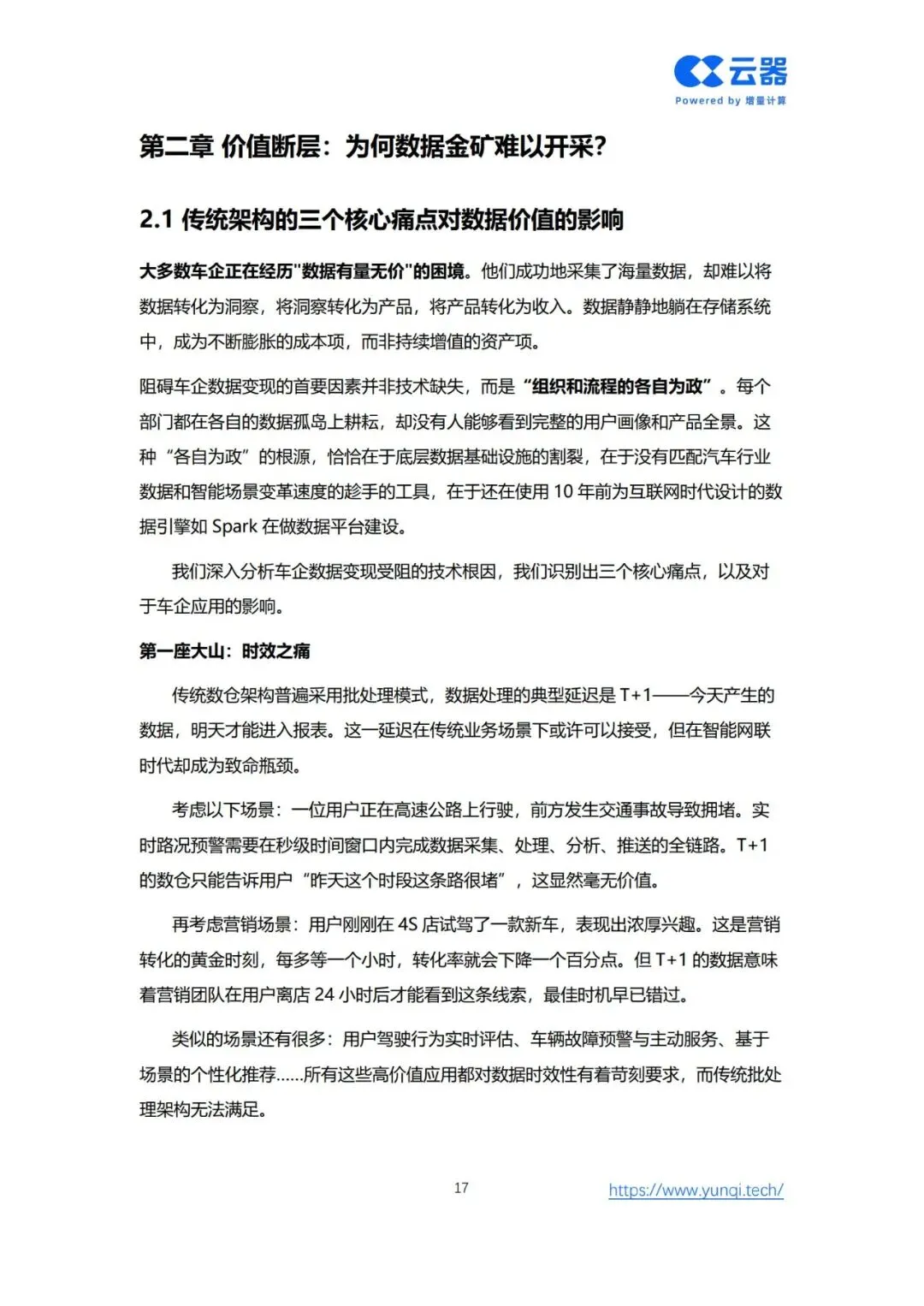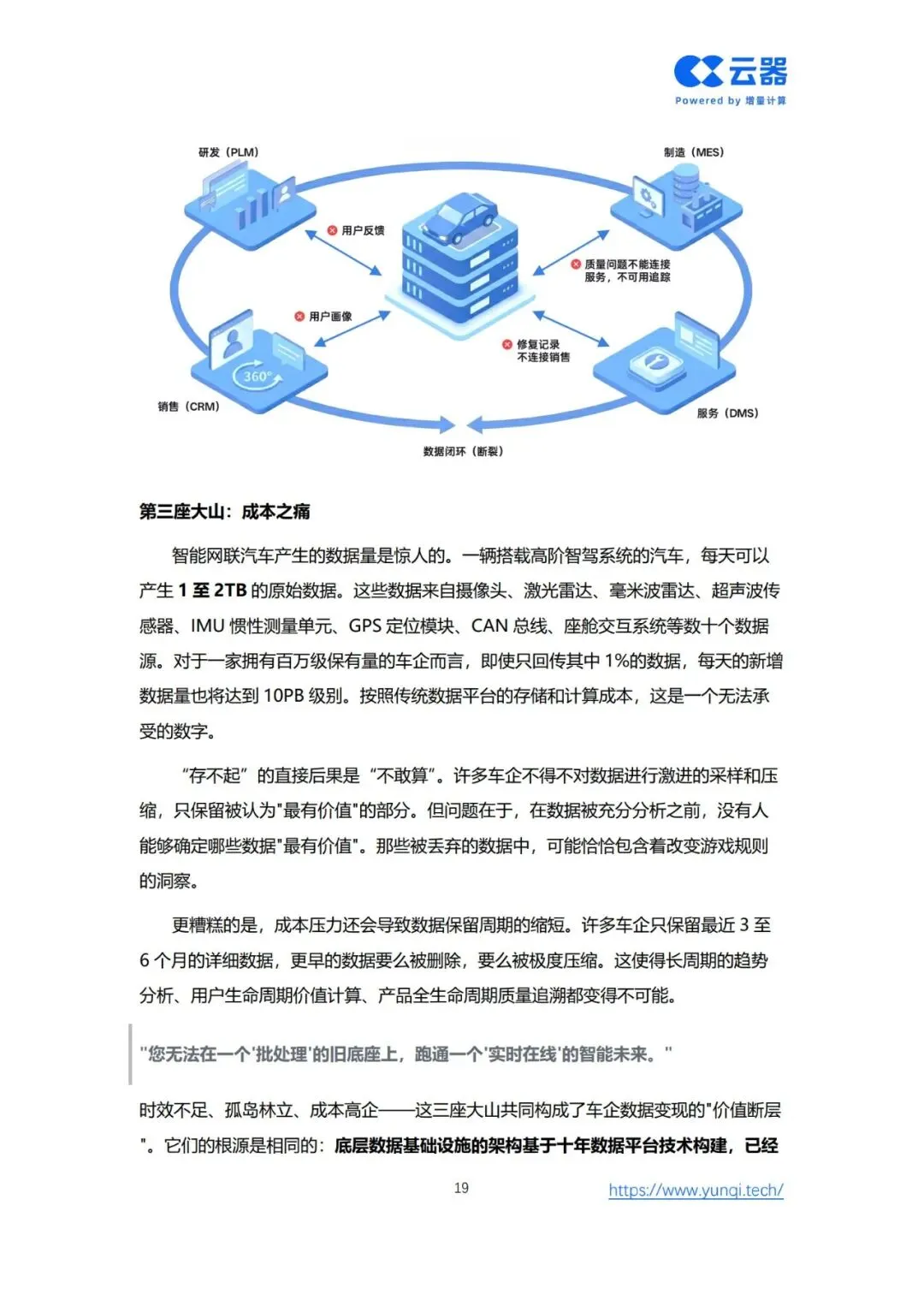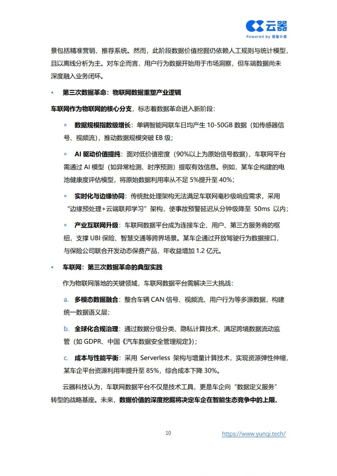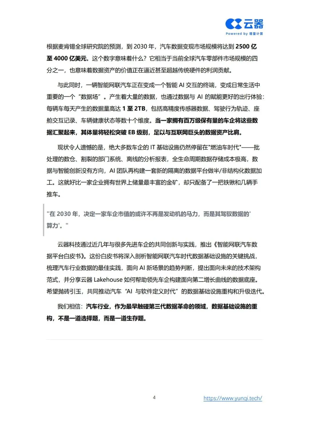 根据麦肯锡全球研究院的预测,到 2030 年,汽车数据变现市场规模将达到 2500 亿 至 4000 亿美元。这个数字意味着什么?它相当于当前全球汽车零部件市场规模的四 分之一,也意味着数据资产的价值正在逼近甚至超越传统硬件的利润贡献。 与此同时,一辆智能网联汽车正在变成一个智能 AI 交互的终端,变成日常生活中 重要的一个“数据场”。产生着大量的数据,也通过数据与 AI 的赋能更好的出行体验: 每辆车每天产生的数据量高达 1 至 2TB,包括高精度传感器数据、驾驶行为轨迹、座 舱交互记录、车辆健康状态等数十个维度。当一家拥有百万级保有量的车企将这些数 据汇聚起来,其体量将轻松突破 EB 级别,足以与互联网巨头的数据资产比肩。现状令人遗憾的是,绝大多数车企的 IT 基础设施仍然停留在"燃油车时代"——批 处理的数仓、割裂的部门系统、离线的分析报表,全生命周期数据存储成本极高,数 据与智能创新没有方向,AI 团队再构建一套新的隔离的数据平台做半/非结构化数据加 工。这就好比一家企业拥有世界上储量最丰富的金矿,却只配备了一把铁锹和几辆手 推车。 "在 2030 年,决定一家车企市值的或许不再是发动机的马力,而是其驾驭数据的' 算力'。" 云器科技通过近几年与很多先进车企的共同创新与实践,推出《智能网联汽车数 据平台白皮书》。这份白皮书将深入剖析智能网联汽车时代数据基础设施的关键挑战, 梳理汽车行业数据的最佳实践,面向 AI 新场景的趋势判断,提出面向未来的技术架构 范式,并分享云器 Lakehouse 如何帮助领先车企构建面向第二增长曲线的数据底座。 希望抛砖引玉,共同推动汽车“AI 与软件定义时代”的数据基础设施重构和升级迭代。 我们相信:汽车行业,作为最早触碰第三代数据革命的领域,数据基础设施的重 构,不是一道选择题,而是一道生存题。随着汽车产业从传统燃油车向新能源汽车加速转型,汽车的角色已从单一的“出 行工具”演变为承载多元生态能力的“智能终端”。这一变革的核心驱动力在于新能 源、数字化与智能化的深度融合,而汽车网联及相关数据平台作为关键基础设施,正 成为支撑车企商业模式升级的核心引擎。 ○性能优化:通过分析车辆行驶数据,如速度、加速度、油耗等,研发团队可 以了解车辆在不同工况下的性能表现,从而优化发动机调校、悬挂系统等,提升 车辆的整体性能。 ○功能改进:收集用户对车辆功能的使用频率和反馈,如导航系统、娱乐系统 等,为功能改进和新功能开发提供依据,满足用户需求。 ○安全设计:分析事故数据和车辆传感器数据,了解事故发生时车辆的状态和 用户行为,为车辆安全设计提供参考,如改进安全气囊触发机制、优化车身结构 等。 •生产制造 ○质量控制:利用生产线上的传感器数据和车辆运行数据,实时监控生产过程 中的质量状况,及时发现并解决生产中的问题,提高产品质量。 ○供应链优化:通过分析供应链数据和车辆销售数据,优化零部件采购和库存 管理,降低生产成本,提高生产效率。 ○故障预测与维护提醒:通过分析车辆传感器数据和历史故障数据,预测车辆 可能出现的故障,提前向用户发送维护提醒,减少车辆故障对用户的影响。 ○远程诊断与维修指导:利用车辆的远程通信功能,技术人员可以远程获取车 辆故障信息,进行初步诊断,并为用户提供维修指导,提高维修效率。 ○服务资源优化:根据车辆分布和故障情况,合理安排售后服务资源,如维修 站点、零部件库存等,提高售后服务的响应速度和质量。 ○用户画像与精准营销:通过分析用户的基本信息、驾驶习惯、车辆使用情况 等数据,构建用户画像,实现精准营销,为用户提供个性化的营销活动和产品推荐。