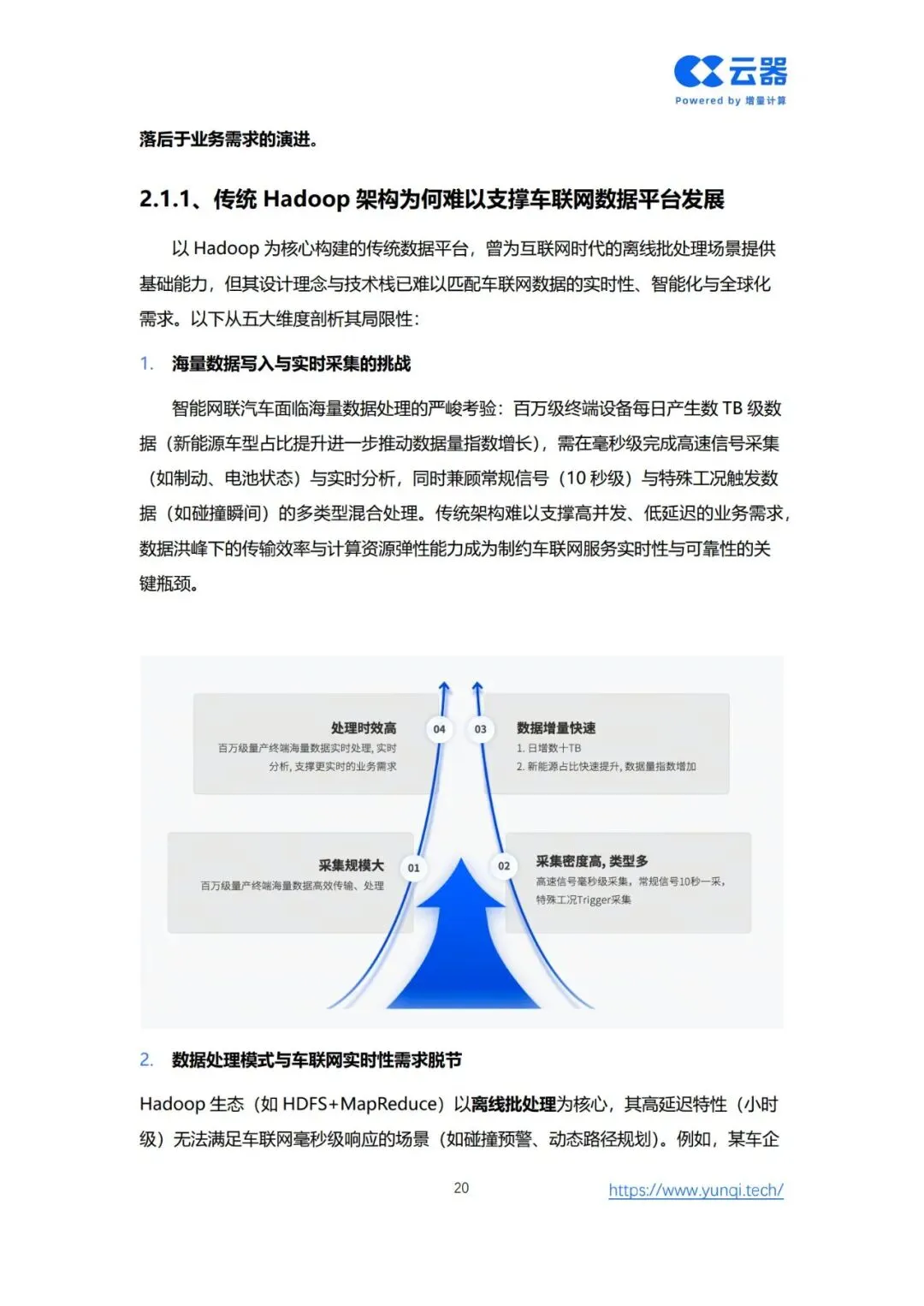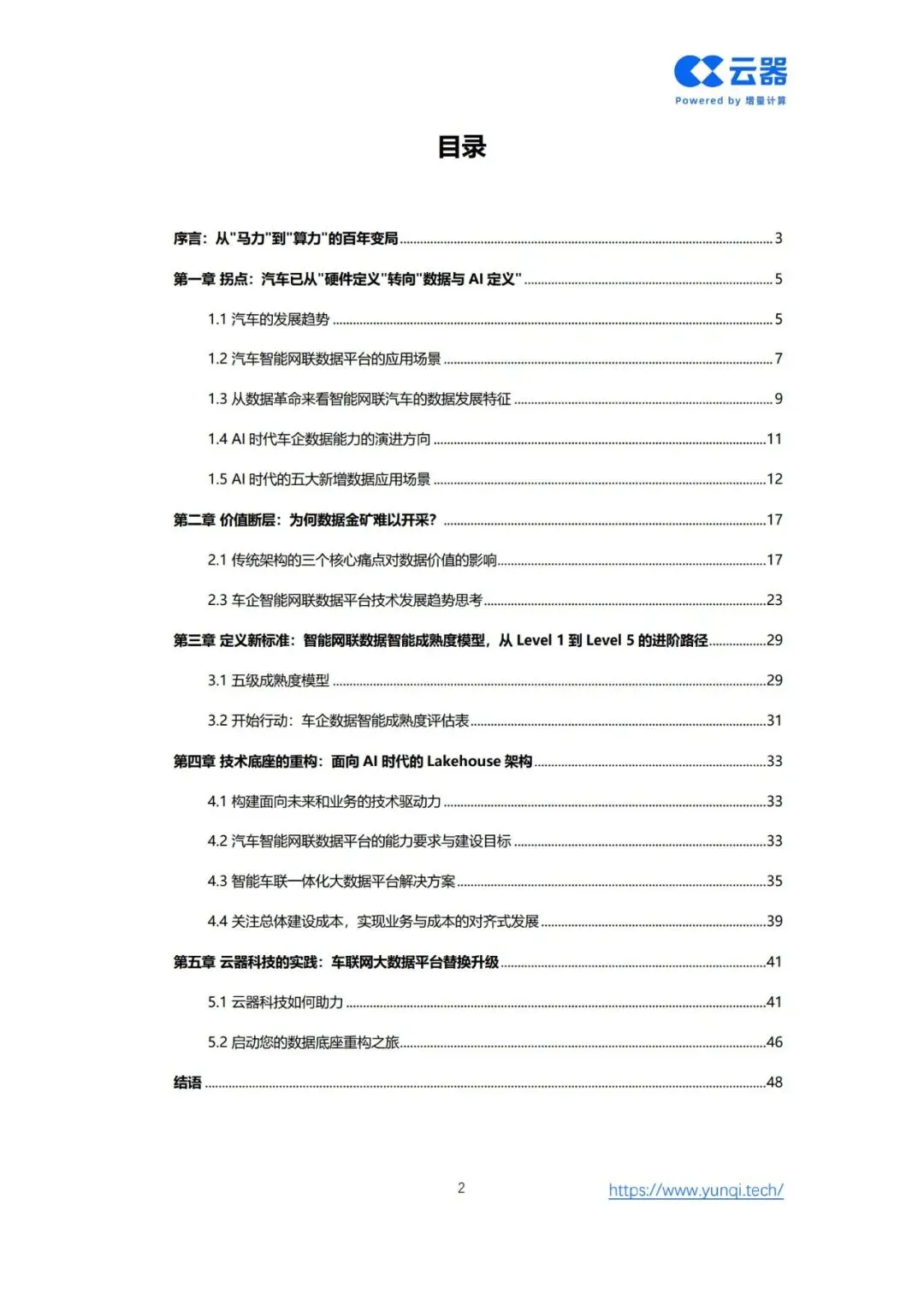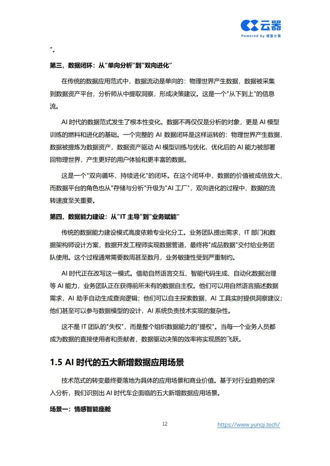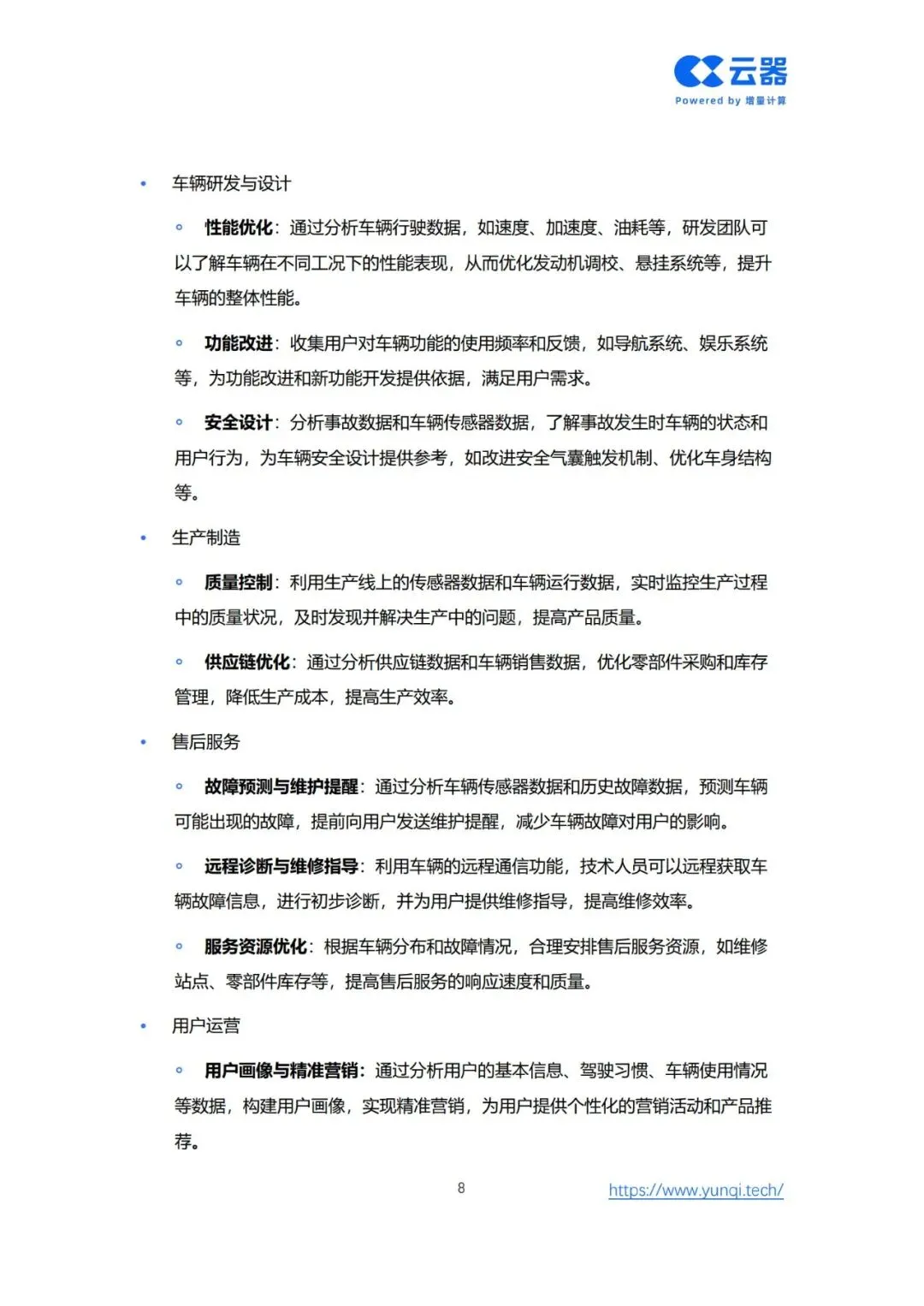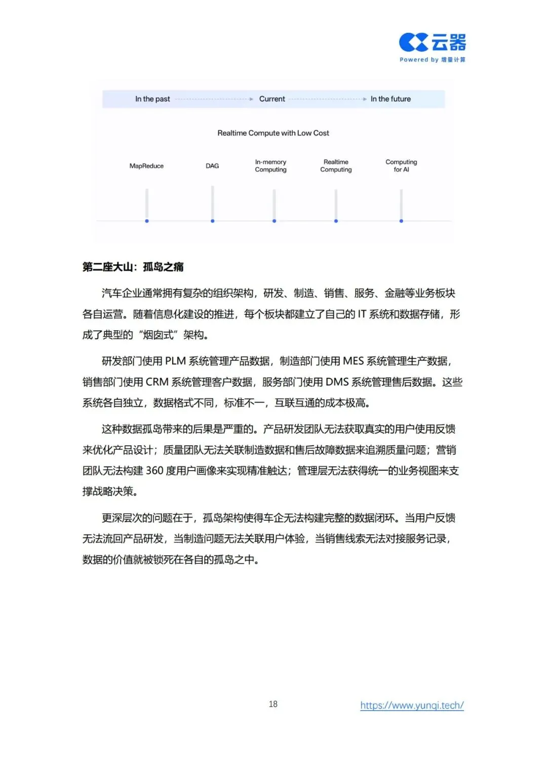 根据麦肯锡全球研究院的预测,到 2030 年,汽车数据变现市场规模将达到 2500 亿 至 4000 亿美元。这个数字意味着什么?它相当于当前全球汽车零部件市场规模的四 分之一,也意味着数据资产的价值正在逼近甚至超越传统硬件的利润贡献。 与此同时,一辆智能网联汽车正在变成一个智能 AI 交互的终端,变成日常生活中 重要的一个“数据场”。产生着大量的数据,也通过数据与 AI 的赋能更好的出行体验: 每辆车每天产生的数据量高达 1 至 2TB,包括高精度传感器数据、驾驶行为轨迹、座 舱交互记录、车辆健康状态等数十个维度。当一家拥有百万级保有量的车企将这些数 据汇聚起来,其体量将轻松突破 EB 级别,足以与互联网巨头的数据资产比肩。现状令人遗憾的是,绝大多数车企的 IT 基础设施仍然停留在"燃油车时代"——批 处理的数仓、割裂的部门系统、离线的分析报表,全生命周期数据存储成本极高,数 据与智能创新没有方向,AI 团队再构建一套新的隔离的数据平台做半/非结构化数据加 工。这就好比一家企业拥有世界上储量最丰富的金矿,却只配备了一把铁锹和几辆手 推车。 "在 2030 年,决定一家车企市值的或许不再是发动机的马力,而是其驾驭数据的' 算力'。" 云器科技通过近几年与很多先进车企的共同创新与实践,推出《智能网联汽车数 据平台白皮书》。这份白皮书将深入剖析智能网联汽车时代数据基础设施的关键挑战, 梳理汽车行业数据的最佳实践,面向 AI 新场景的趋势判断,提出面向未来的技术架构 范式,并分享云器 Lakehouse 如何帮助领先车企构建面向第二增长曲线的数据底座。 希望抛砖引玉,共同推动汽车“AI 与软件定义时代”的数据基础设施重构和升级迭代。 我们相信:汽车行业,作为最早触碰第三代数据革命的领域,数据基础设施的重 构,不是一道选择题,而是一道生存题。随着汽车产业从传统燃油车向新能源汽车加速转型,汽车的角色已从单一的“出 行工具”演变为承载多元生态能力的“智能终端”。这一变革的核心驱动力在于新能 源、数字化与智能化的深度融合,而汽车网联及相关数据平台作为关键基础设施,正 成为支撑车企商业模式升级的核心引擎。 ○性能优化:通过分析车辆行驶数据,如速度、加速度、油耗等,研发团队可 以了解车辆在不同工况下的性能表现,从而优化发动机调校、悬挂系统等,提升 车辆的整体性能。 ○功能改进:收集用户对车辆功能的使用频率和反馈,如导航系统、娱乐系统 等,为功能改进和新功能开发提供依据,满足用户需求。 ○安全设计:分析事故数据和车辆传感器数据,了解事故发生时车辆的状态和 用户行为,为车辆安全设计提供参考,如改进安全气囊触发机制、优化车身结构 等。 •生产制造 ○质量控制:利用生产线上的传感器数据和车辆运行数据,实时监控生产过程 中的质量状况,及时发现并解决生产中的问题,提高产品质量。 ○供应链优化:通过分析供应链数据和车辆销售数据,优化零部件采购和库存 管理,降低生产成本,提高生产效率。 ○故障预测与维护提醒:通过分析车辆传感器数据和历史故障数据,预测车辆 可能出现的故障,提前向用户发送维护提醒,减少车辆故障对用户的影响。 ○远程诊断与维修指导:利用车辆的远程通信功能,技术人员可以远程获取车 辆故障信息,进行初步诊断,并为用户提供维修指导,提高维修效率。 ○服务资源优化:根据车辆分布和故障情况,合理安排售后服务资源,如维修 站点、零部件库存等,提高售后服务的响应速度和质量。 ○用户画像与精准营销:通过分析用户的基本信息、驾驶习惯、车辆使用情况 等数据,构建用户画像,实现精准营销,为用户提供个性化的营销活动和产品推荐。