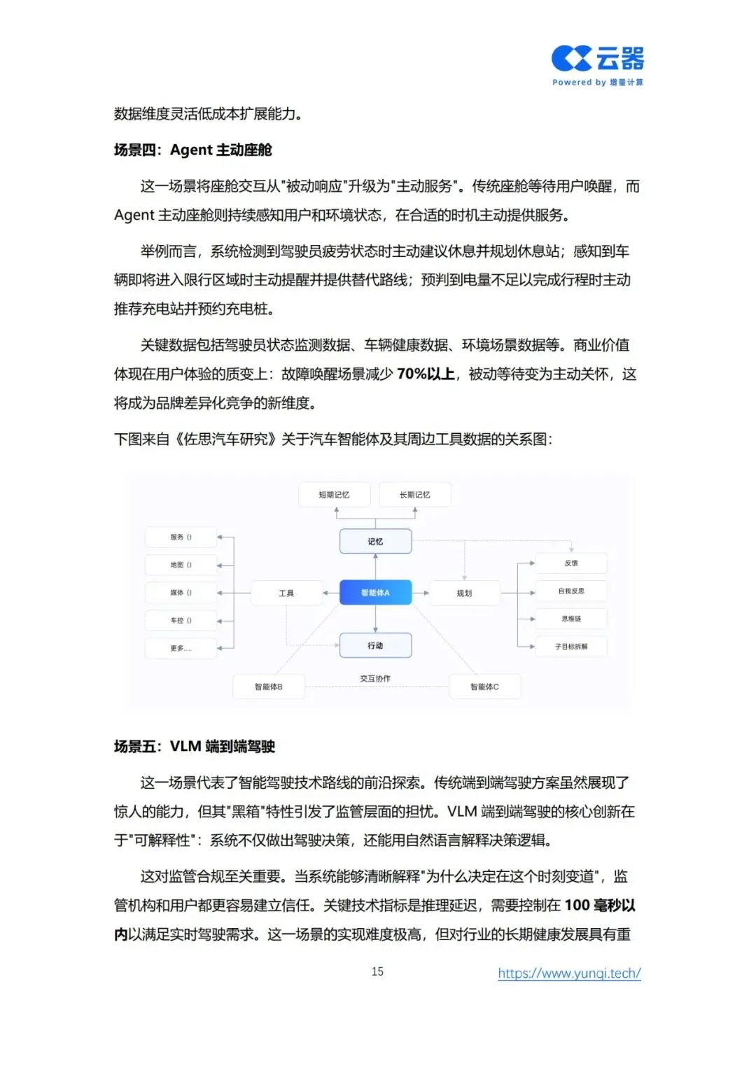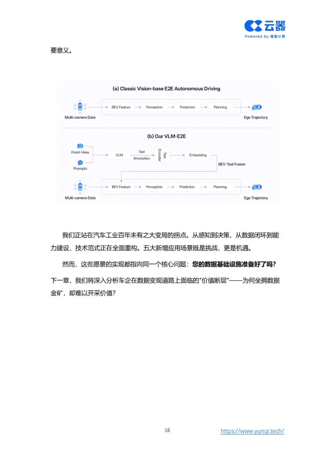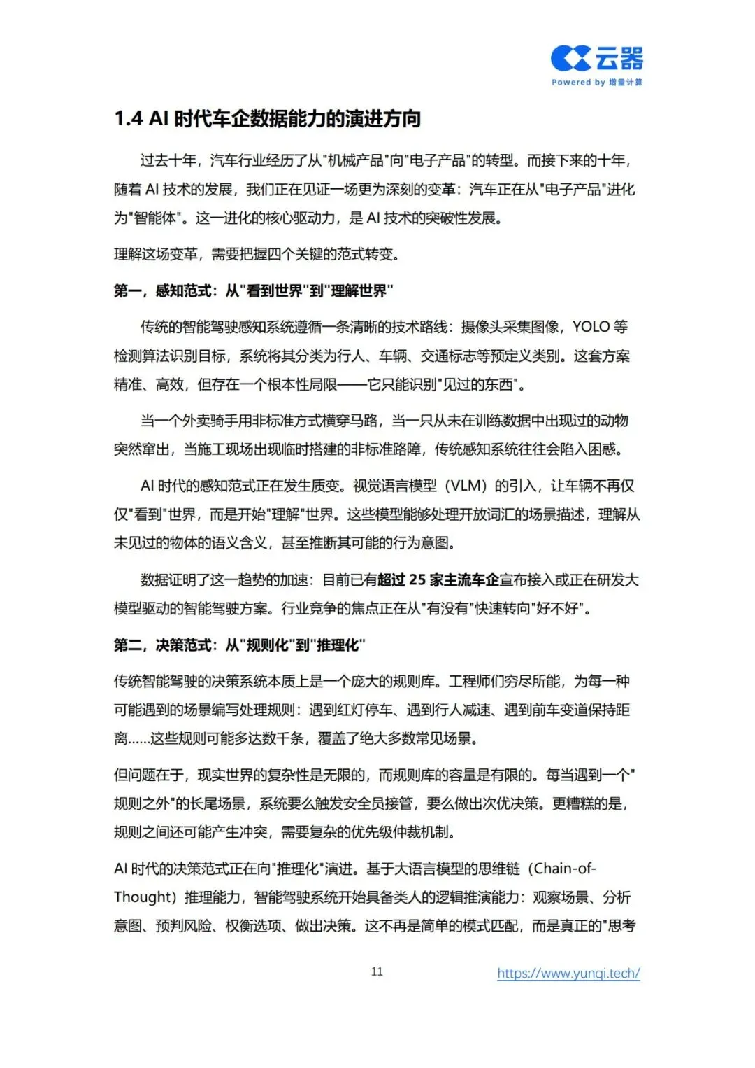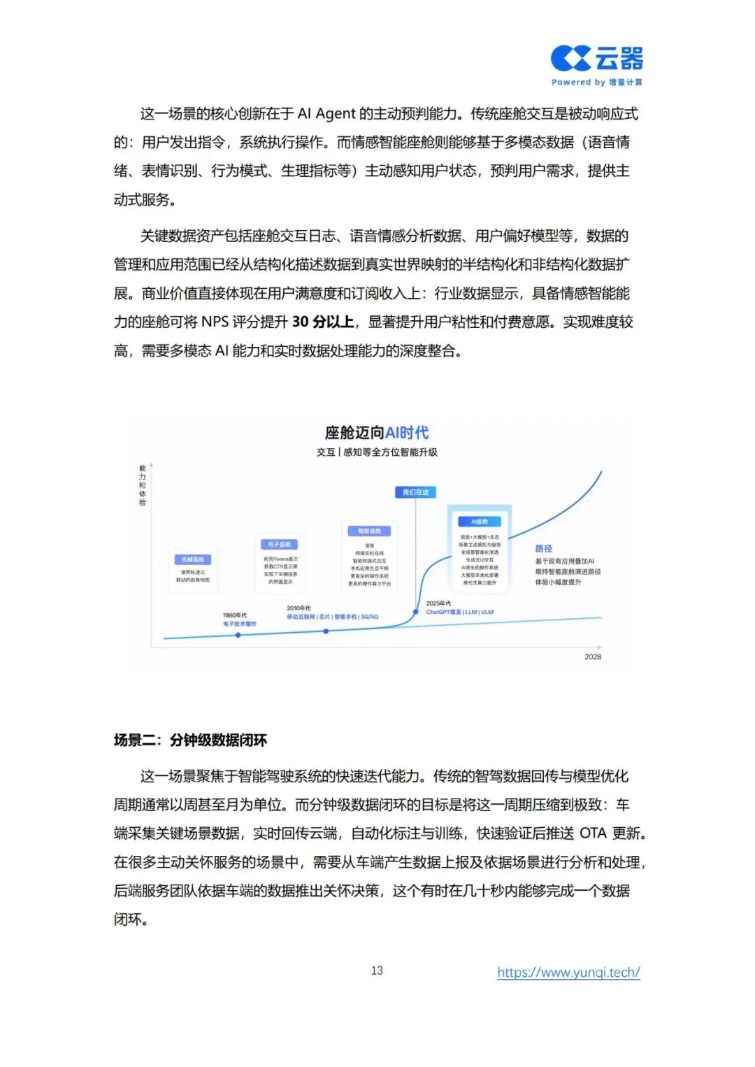 根据麦肯锡全球研究院的预测,到 2030 年,汽车数据变现市场规模将达到 2500 亿 至 4000 亿美元。这个数字意味着什么?它相当于当前全球汽车零部件市场规模的四 分之一,也意味着数据资产的价值正在逼近甚至超越传统硬件的利润贡献。 与此同时,一辆智能网联汽车正在变成一个智能 AI 交互的终端,变成日常生活中 重要的一个“数据场”。产生着大量的数据,也通过数据与 AI 的赋能更好的出行体验: 每辆车每天产生的数据量高达 1 至 2TB,包括高精度传感器数据、驾驶行为轨迹、座 舱交互记录、车辆健康状态等数十个维度。当一家拥有百万级保有量的车企将这些数 据汇聚起来,其体量将轻松突破 EB 级别,足以与互联网巨头的数据资产比肩。现状令人遗憾的是,绝大多数车企的 IT 基础设施仍然停留在"燃油车时代"——批 处理的数仓、割裂的部门系统、离线的分析报表,全生命周期数据存储成本极高,数 据与智能创新没有方向,AI 团队再构建一套新的隔离的数据平台做半/非结构化数据加 工。这就好比一家企业拥有世界上储量最丰富的金矿,却只配备了一把铁锹和几辆手 推车。 "在 2030 年,决定一家车企市值的或许不再是发动机的马力,而是其驾驭数据的' 算力'。" 云器科技通过近几年与很多先进车企的共同创新与实践,推出《智能网联汽车数 据平台白皮书》。这份白皮书将深入剖析智能网联汽车时代数据基础设施的关键挑战, 梳理汽车行业数据的最佳实践,面向 AI 新场景的趋势判断,提出面向未来的技术架构 范式,并分享云器 Lakehouse 如何帮助领先车企构建面向第二增长曲线的数据底座。 希望抛砖引玉,共同推动汽车“AI 与软件定义时代”的数据基础设施重构和升级迭代。 我们相信:汽车行业,作为最早触碰第三代数据革命的领域,数据基础设施的重 构,不是一道选择题,而是一道生存题。随着汽车产业从传统燃油车向新能源汽车加速转型,汽车的角色已从单一的“出 行工具”演变为承载多元生态能力的“智能终端”。这一变革的核心驱动力在于新能 源、数字化与智能化的深度融合,而汽车网联及相关数据平台作为关键基础设施,正 成为支撑车企商业模式升级的核心引擎。 ○性能优化:通过分析车辆行驶数据,如速度、加速度、油耗等,研发团队可 以了解车辆在不同工况下的性能表现,从而优化发动机调校、悬挂系统等,提升 车辆的整体性能。 ○功能改进:收集用户对车辆功能的使用频率和反馈,如导航系统、娱乐系统 等,为功能改进和新功能开发提供依据,满足用户需求。 ○安全设计:分析事故数据和车辆传感器数据,了解事故发生时车辆的状态和 用户行为,为车辆安全设计提供参考,如改进安全气囊触发机制、优化车身结构 等。 •生产制造 ○质量控制:利用生产线上的传感器数据和车辆运行数据,实时监控生产过程 中的质量状况,及时发现并解决生产中的问题,提高产品质量。 ○供应链优化:通过分析供应链数据和车辆销售数据,优化零部件采购和库存 管理,降低生产成本,提高生产效率。 ○故障预测与维护提醒:通过分析车辆传感器数据和历史故障数据,预测车辆 可能出现的故障,提前向用户发送维护提醒,减少车辆故障对用户的影响。 ○远程诊断与维修指导:利用车辆的远程通信功能,技术人员可以远程获取车 辆故障信息,进行初步诊断,并为用户提供维修指导,提高维修效率。 ○服务资源优化:根据车辆分布和故障情况,合理安排售后服务资源,如维修 站点、零部件库存等,提高售后服务的响应速度和质量。 ○用户画像与精准营销:通过分析用户的基本信息、驾驶习惯、车辆使用情况 等数据,构建用户画像,实现精准营销,为用户提供个性化的营销活动和产品推荐。