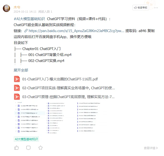 致力于提供大模型学习路径的相关资料,包括:基础知识、AI大模型最新研报、白皮书、AI大模型应用案例、AI大模型相关书籍、理论学习、实践操作、专项深入、项目应用、拓展研究等相关资料的藏宝库。 现在加入,即刻拥有属于自己的更大的朋友圈,同时享受8大核心权益: 1、1万+份AI大模型学习材料无限共亨:相关书籍、报告、白皮书、案例(持续更新中)2、AI大模型应用场景:智能制造/办公场景/政务场景···等应用案例/报告材料无限共亨(持续更新中)①IT工程师/产品经理、AI时代白领、灰领和部分蓝领、AI产品经理 ③想基于组织内私有知识库搭建AI Agent、想晋升技术总监、架构、CTO和CIO ④计算机专业在校/应届生想找AI大模型工程师的工作是带你深入了解大模型领域的优质学习资源。教程以清晰直观的视频形式呈现,从大模型的基本概念入手,逐步深入讲解其工作原理、应用场景及实际操作方法。无论你是技术小白还是专业人士,都能从中获得启发。通过学习本教程,你将掌握大模型的关键知识,提升在人工智能时代的竞争力,为探索创新应用和解决实际问题打下坚实基础。├── 001-ChatGPT背景介绍.mp4 │ ├── 003-ChatGPT注册和使用.mp4 │ ├── 004-ChatGPT的3种使用方式.mp4 │ ├── 005-ChatGPT入门程序.mp4 │ ├── 006-ChatGPT应用场景.mp4 │ ├── 007-ChatGPT帮你完成Java类代码-场景1.mp4 │ ├── 008-ChatGPT帮你完成前端代码-场景2.mp4 │ ├── 009-ChatGPT帮你完成Python类代码-场景3.mp4 │ ├── 010-ChatGPT帮你完成SQL代码-场景4.mp4 │ ├── 011-ChatGPT帮你完成Shell代码-场景5.mp4 │ ├── 012-ChatGPT帮你找Bug-场景6.mp4 │ ├── 013-ChatGPT帮你完成人工智能相关代码-场景7.mp4 │ └── 014-ChatGPT帮你完成大数据相关代码-场景8.mp4 ├── 001-ChatGPT项目实战之项目背景介绍.mp4 │ ├── 002-ChatGPT项目实战之项目架构.mp4 │ ├── 003-ChatGPT项目实战之RNN、模型简介.mp4 │ ├── 004-ChatGPT项目实战之数据获取.mp4 │ ├── 005-ChatGPT项目实战之数据预处理模块1.mp4 │ ├── 006-ChatGPT项目实战之数据预处理模块2.mp4 │ ├── 007-ChatGPT项目实战之ChatGPT模型构建实战.mp4 │ ├── 008-ChatGPT项目实战之ChatGPT模型训练实战.mp4 │ ├── 009-ChatGPT项目实战之ChatGPT模型预测实战.mp4 │ └── 010-ChatGPT项目实战之ChatGPT模型验证和结果分析.mp4 ├├── 001-ChatGPT原理之深度学习基础.mp4 │ ├── 002-ChatGPT原理之什么是语言模型.mp4 │ ├── 003-ChatGPT原理之语言模型分类.mp4 │ ├── 004-ChatGPT原理之GPT-1模型结构简介.mp4 │ ├── 005-ChatGPT原理之GPT-1模型训练.mp4 │ ├── 006-ChatGPT原理之GPT-2模型训练.mp4 │ ├── 007-ChatGPT原理之GPT-3模型训练.mp4 │ └── 008-ChatGPT原理之GhatGPT原理.mp4 └── ├── 02-ChatGPT项目实战 .pdf │ ── VSCodeUserSetup-x64-1.54.3.exe └── 7 directories, 39 files·····