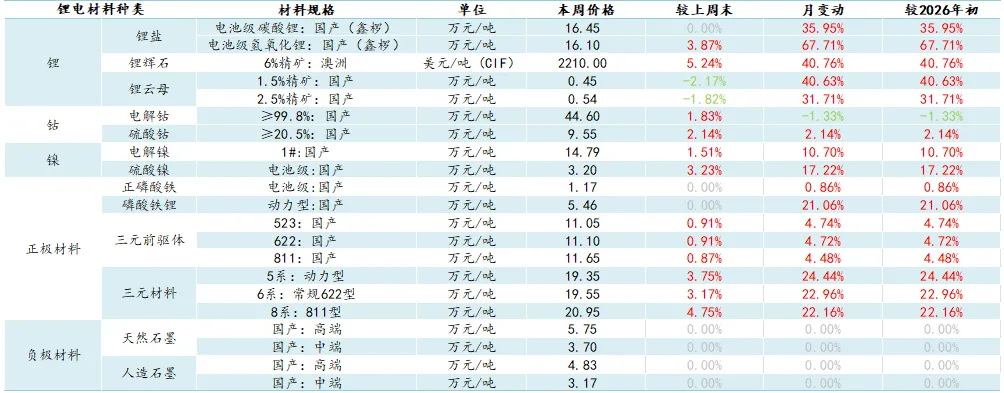截至本周末,国产电池级碳酸锂价格为16.45万元/吨,与上周末持平;国产电池级氢氧化锂价格为16.10万元/吨,较上周末涨幅3.87% 。