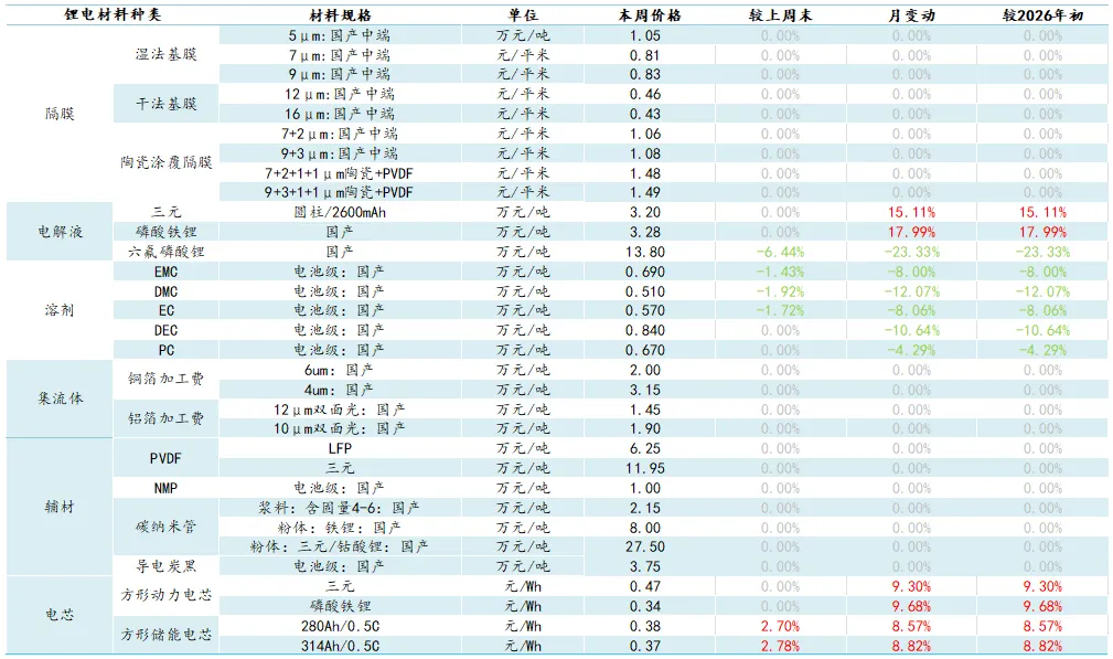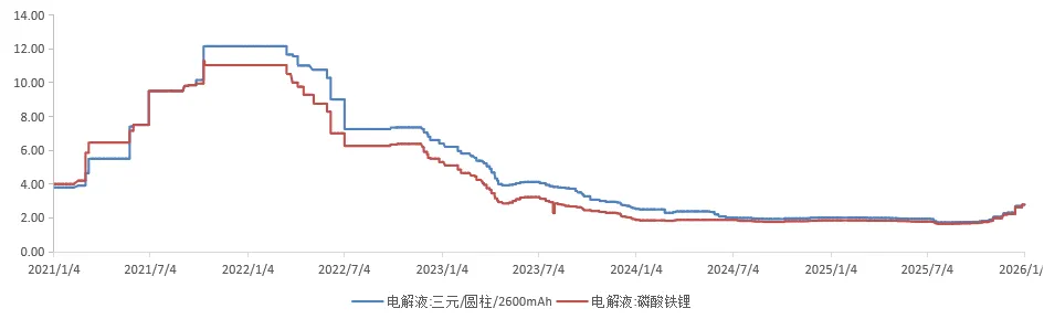 三元电解液(圆柱/2600mAh)本周末均价为3.20万元/吨,与上周末持平;磷酸铁锂电解液均价为3.28万元/吨,与上周末持平。