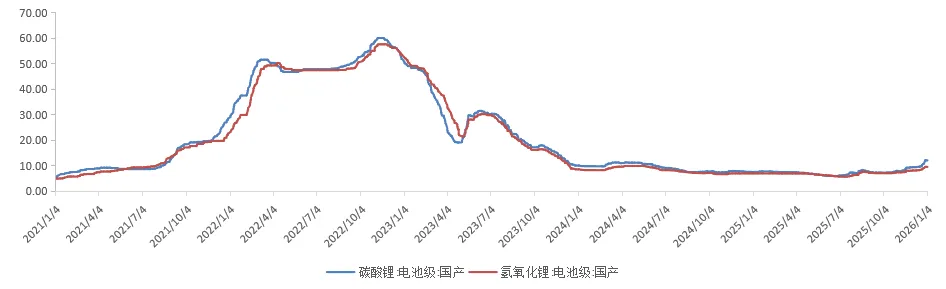 图1:碳酸锂与氢氧化锂价格走势(万元/吨)