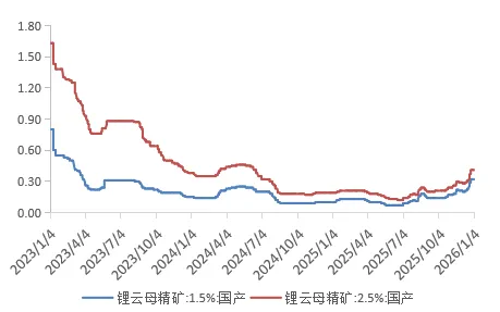 图3:国产1.5%锂云母精矿及国产2.5%锂云母精矿价格走势(万元/吨)