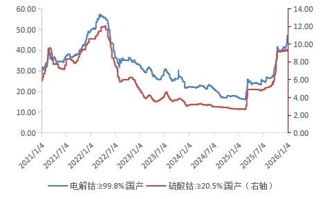 图4:电解钴与硫酸钴(右轴)价格走势(万元/吨)