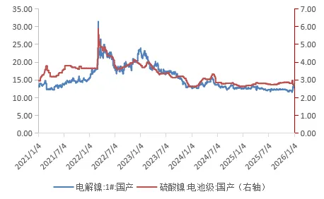图5:电解镍与硫酸镍(右轴)价格走势(万元/吨)