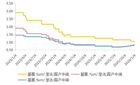 湿法基膜5μm(中端)均价为1.05元/平方米,与上周末持平;湿法基膜7μm(中端)均价为0.81元/平方米,与上周末持平;国产湿法基膜9μm(中端)均价0.83元/平方米,与上周末持平。