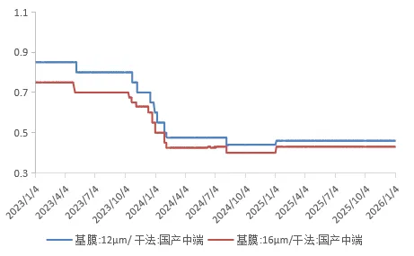 国产干法基膜,本周末12μm(中端)均价为0.46元/平方米,与上周末持平,本周末16μm(中端)均价为0.43元/平方米,与上周末持平。