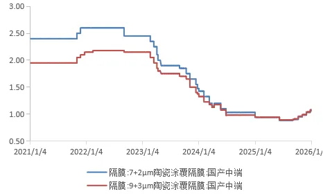 7+2μm陶瓷涂覆隔膜(国产中端)均价为1.06元/平方米,与上周末持平;9+3μm陶瓷涂覆隔膜(国产中端)均价为1.08元/平方米,与上周末持平。