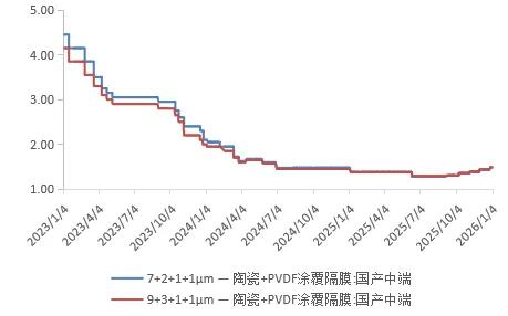7+2+1+1μm陶瓷+PVDF涂覆隔膜(国产中端)均价为1.48元/平方米,与上周末持平,9+3+1+1μm陶瓷+PVDF涂覆隔膜(国产中端)均价为1.49元/平方米,较上周末涨幅与上周末持平。