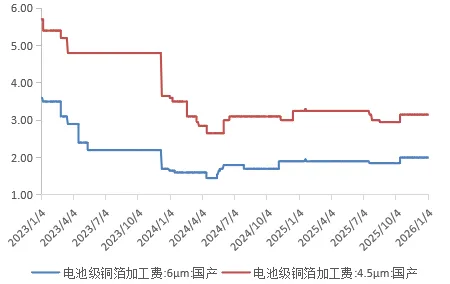 本周国产6μm电池级铜箔加工费均价为2.00万元/吨,与上周末持平,国产4.5μm电池级铜箔加工费均价为3.15万元/吨,与上周末持平。
