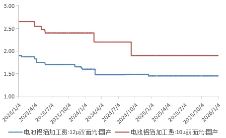 本周国产12μm双面光电池铝箔加工费均价为1.45万元/吨,与上周末持平;国产10μm双面光电池铝箔加工费均价为1.90万元/吨,与上周末持平。
