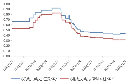 国产三元方形动力电芯本周末均价为0.47元/Wh,与上周末持平。国产磷酸铁锂方形动力电芯本周末均价为0.34元/Wh,与上周末持平。