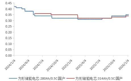 国产280Ah/0.5C方形储能电芯本周末均价为0.38元/Wh,较上周末涨幅2.70%。国产314Ah/0.5C方形储能电芯本周末均价为0.37元/Wh,较上周末涨幅2.78%。