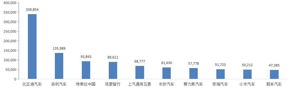 2025年12月国内新能源销量Top10车企中,前3大厂商分别是比亚迪汽车、吉利汽车、特斯拉中国,销量分别为339,854辆、135,989辆和93,843辆。