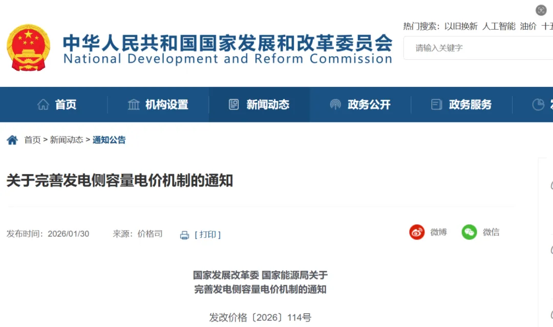 2026年1月30日,国家发展改革委 国家能源局发布《关于完善发电侧容量电价机制的通知》。