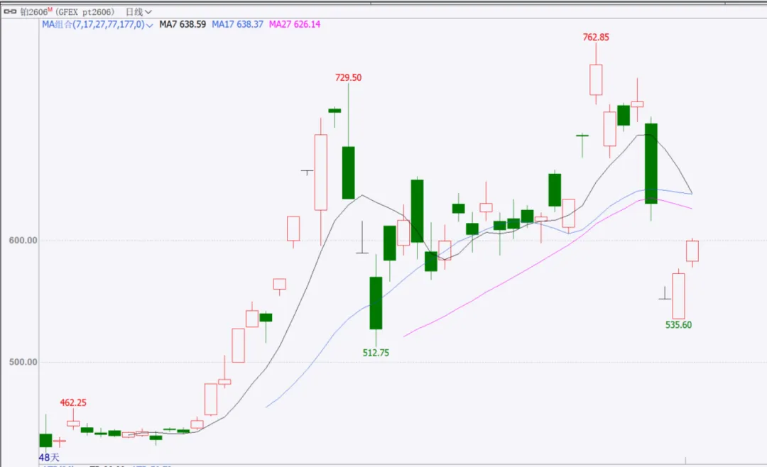 2月4日,铂钯主力合约高开高走,盘中涨幅逾6%,截止下午收盘pt2606合约报599.85,涨幅6.73%,pd2606合约报461,涨幅6.29%。