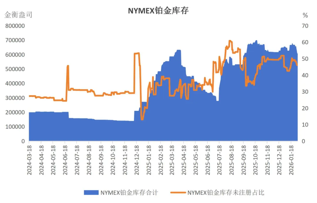 (3)库存:截止2月3日,NYMEX铂金库存为605259盎司,其中未注册库存占比46%,NYMEX钯金库存为208456盎司,其中未注册库存占比29%,库存水平均自高位有所回落。