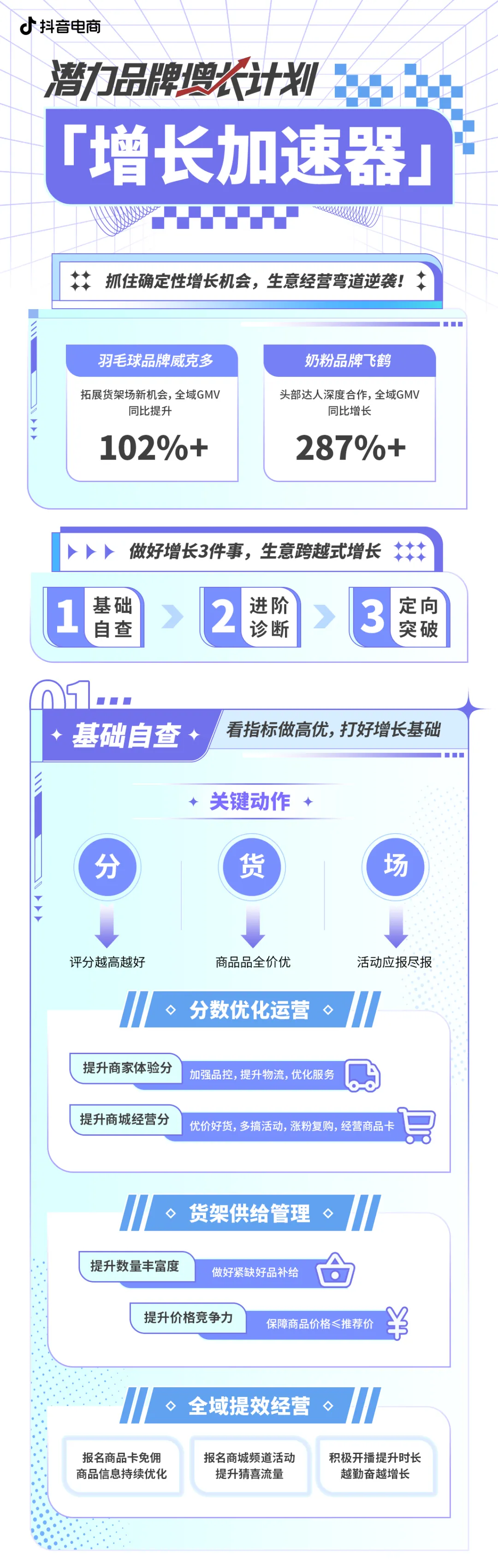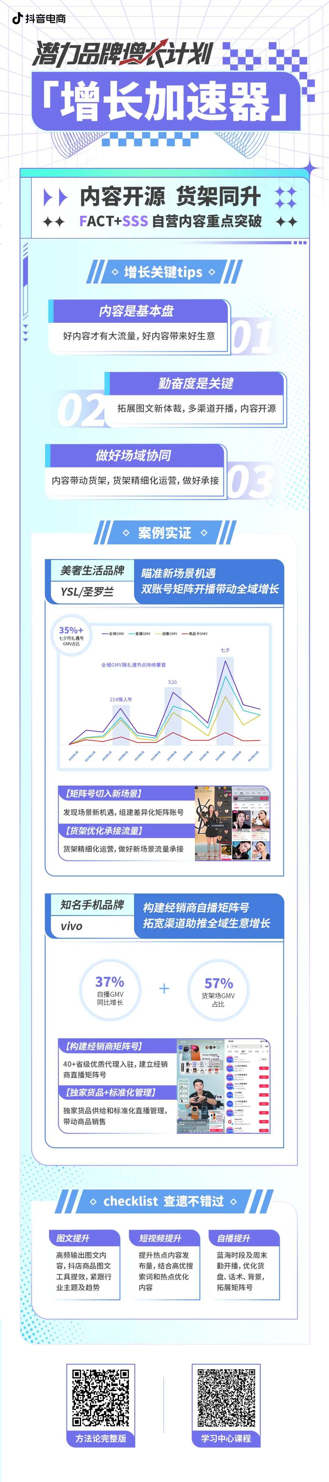 如何用对策略,抓住增长机会?抖音电商潜力品牌增长计划 -「增长加速器」三步走,为品牌提高转化效率、激活生意增长提供方法论指导,助力潜力品牌在抖音电商迎来新增量。未来,抖音电商将持续帮助更多商家激活生意新增量。