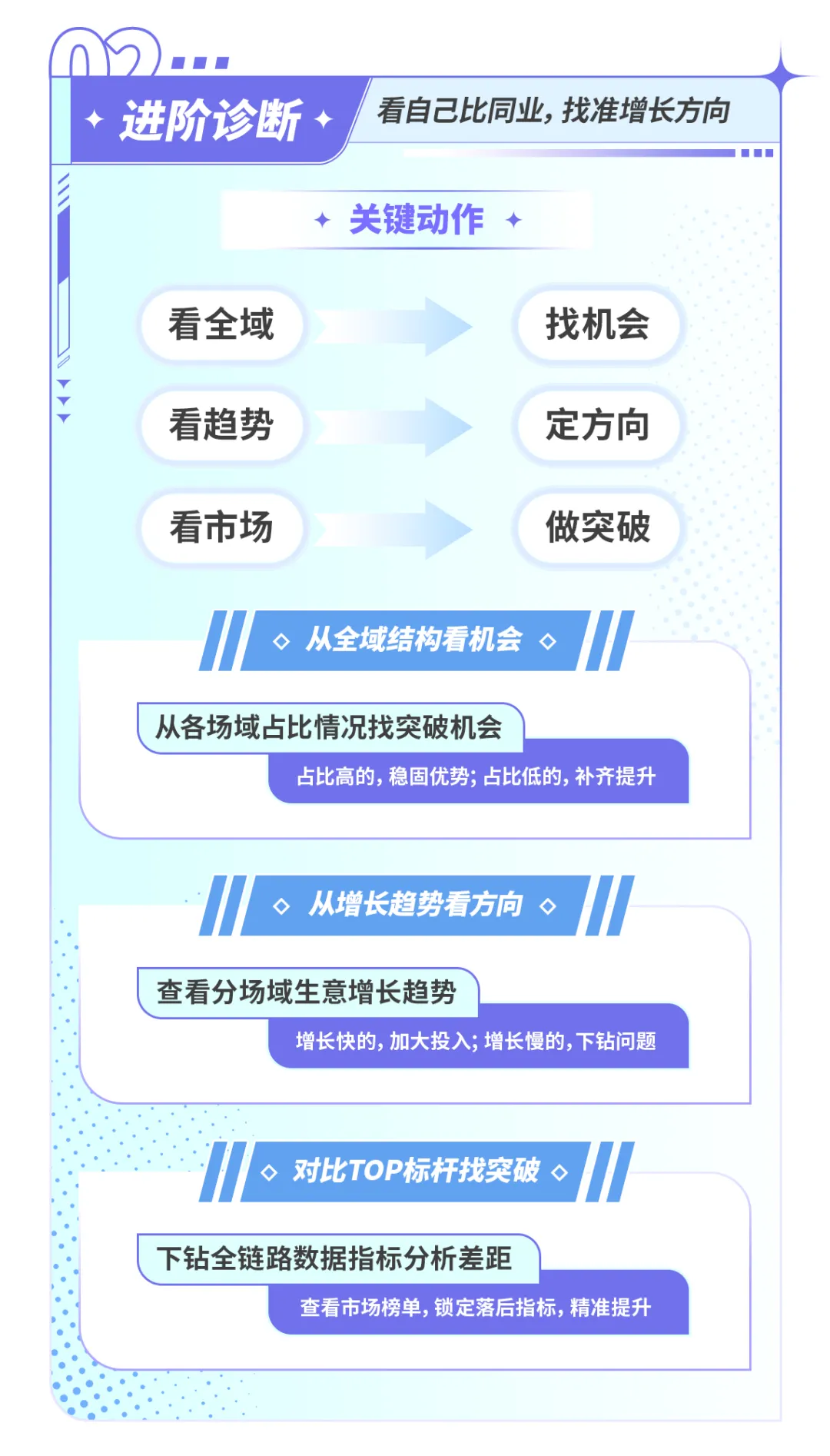 分、货、场指标如何高效定向提升?潜力品牌「增长加速器」通过线索补品、参与活动、优化信息等方式,提供基础数据提升指导方案,助力品牌打开生意增长新空间。