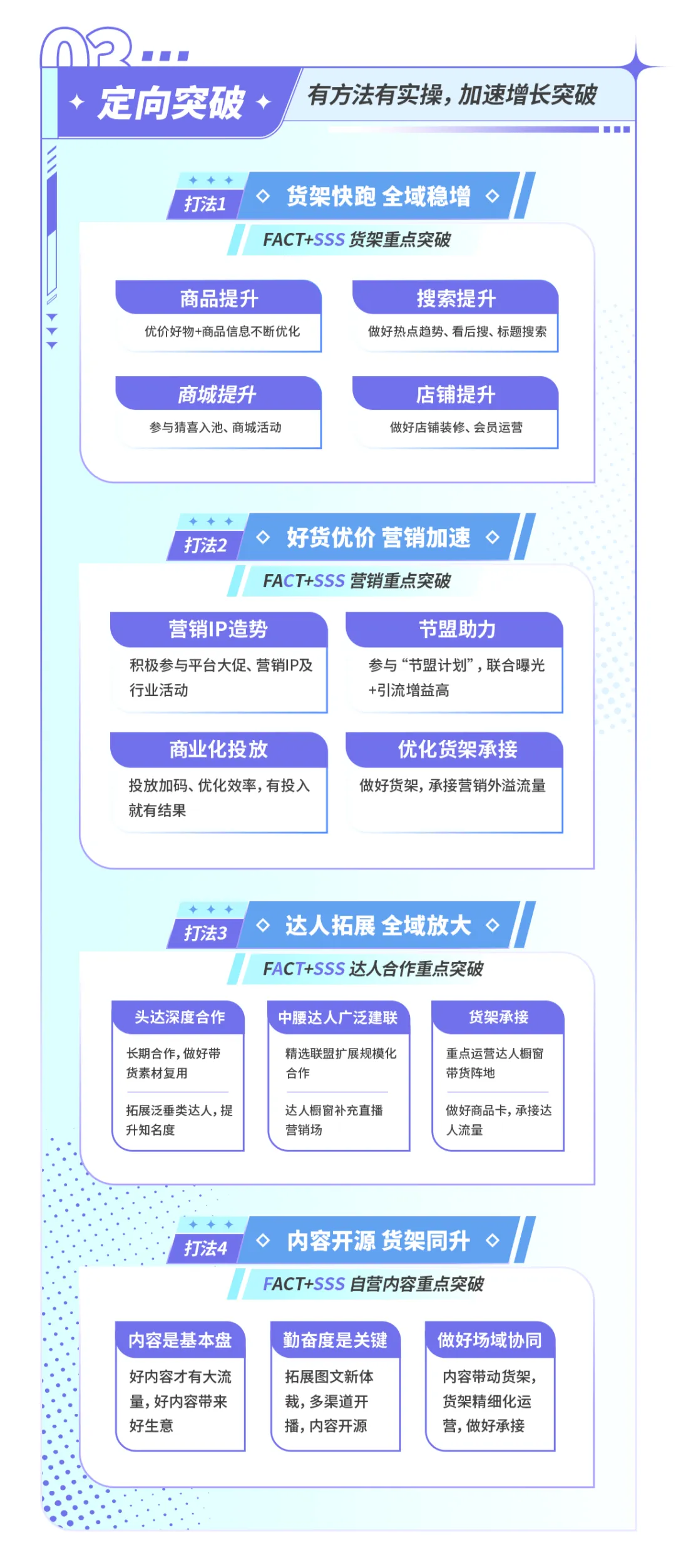 打法1广泛适用于各类需要在「货架」重点突破的商家。在全域兴趣电商,货架经营成本更具优势,品牌一旦积累了丰富且完整的货架经验,可复用平移到全品类线。做好“商品+搜索+商城+店铺”四维提升,各类品牌都可在抖音电商通过「货架快跑」,低成本撬动高收益。