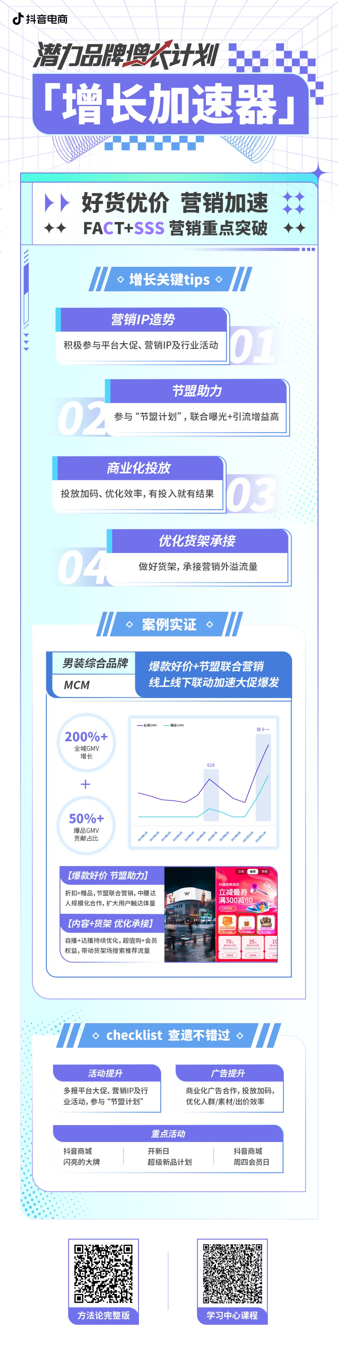 不同类型的打法适用于不同诉求的商家,无论是哪个行业、哪个体量,无论是成熟品牌还是成长型品牌,都可以在抖音电商,运用「增长加速器」挖掘自身潜力,拥抱确定性生意增长。