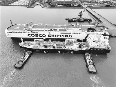 1月29日,液化天然气(LNG)加注船“海港未来”号在上海外高桥海通码头搭靠利比里亚籍“黄河口”滚装轮(如图),在11小时内完成约2200立方米LNG加注作业任务。