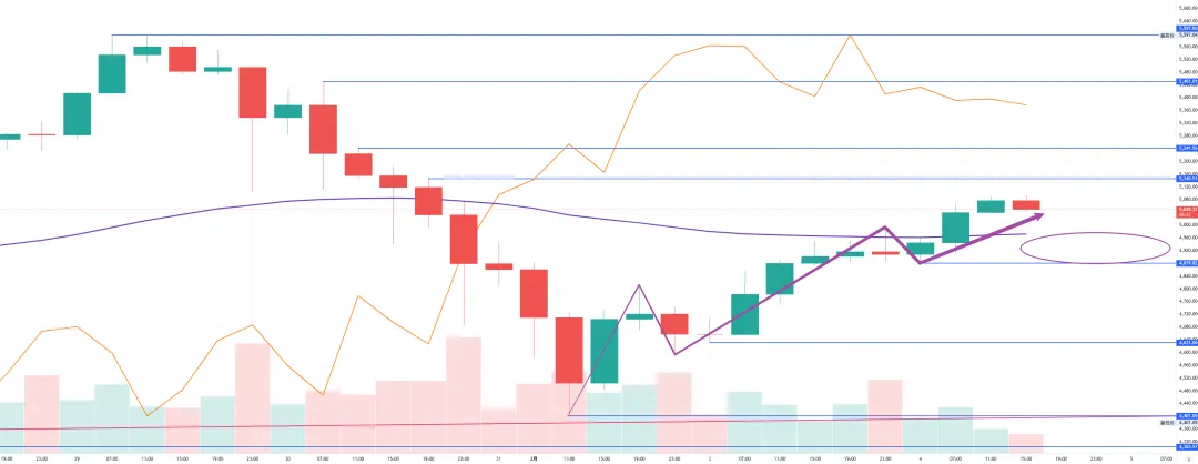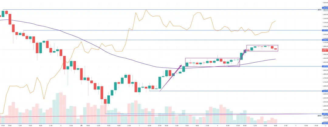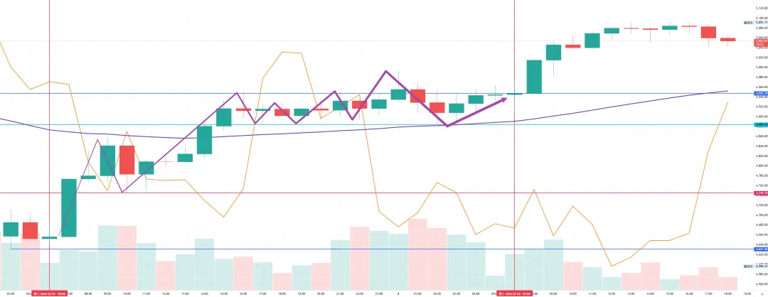 4小时周期上,金价上涨趋势也开始成形,后续重点关注图中紫圈内200小时均线与4880美元支撑位组成的区间支撑力度。