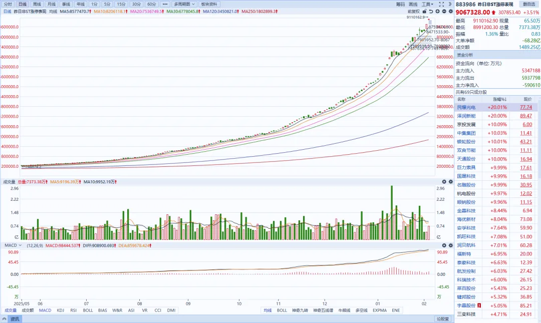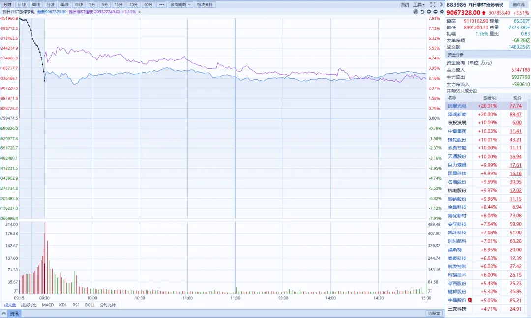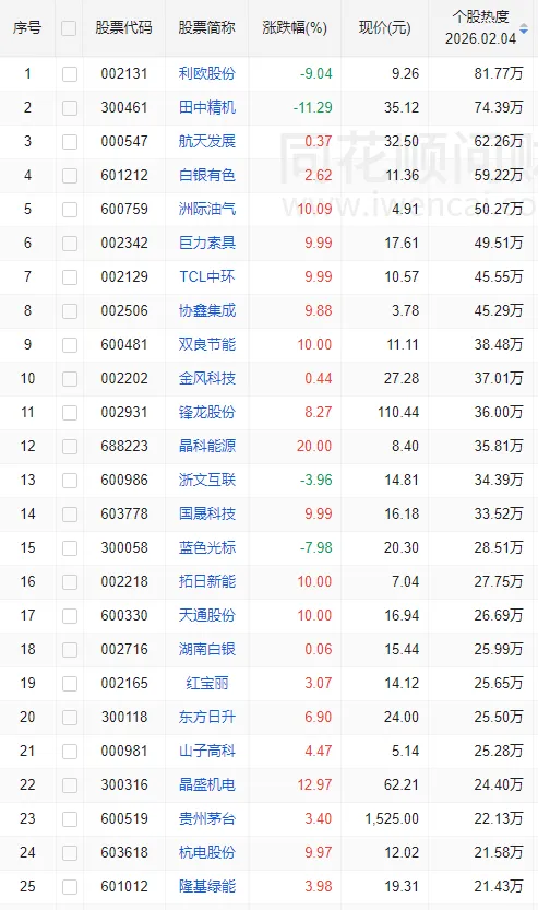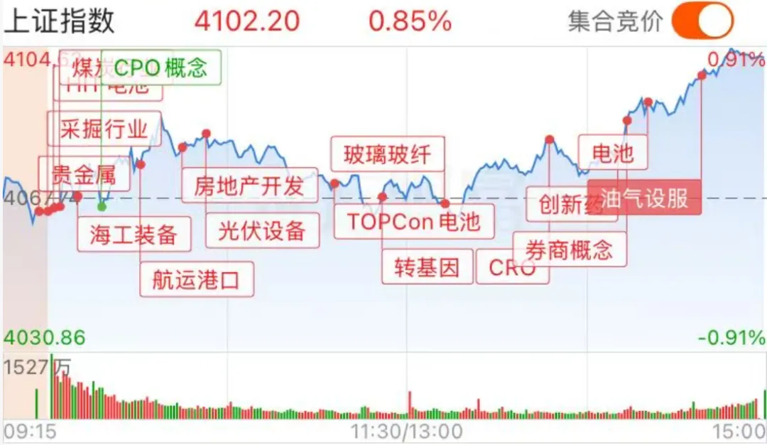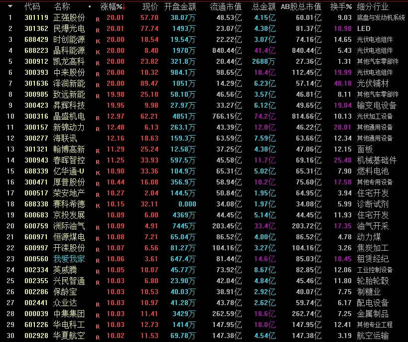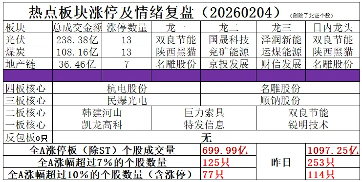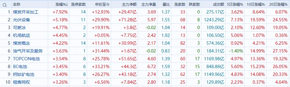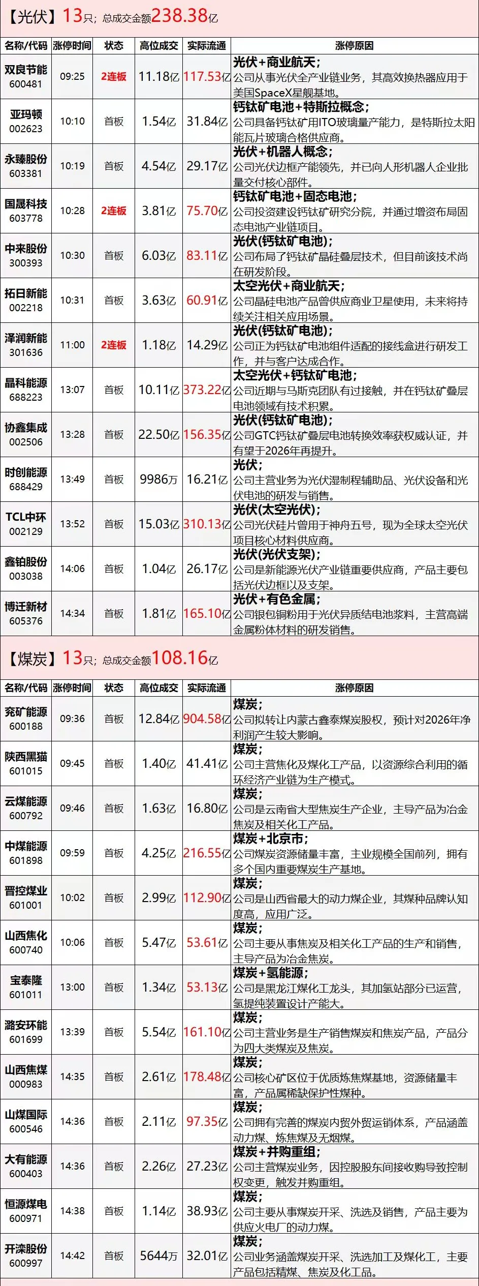 个股方面:涨多跌少,3254只个股上涨,2130只个股下跌。盘面上,市场热点快速轮动,全市场超3200只个股上涨。从板块来看,煤炭概念掀起涨停潮,十余只成分股涨停,陕西黑猫、兖矿能源、中煤能源涨停。太空光伏概念爆发,中来股份20cm涨停,国晟科技2连板。机场航运概念走强,中国东航、华夏航空涨停。房地产板块表现活跃,荣安地产、财信发展、我爱我家涨停。氢能源概念快速拉升,京城股份、致远新能涨停。下跌方面,AI应用、贵金属、算力硬件等板块跌幅居前。其中AI应用概念集体下挫,引力传媒、天地在线跌停,值得买、世纪恒通等多股大跌。