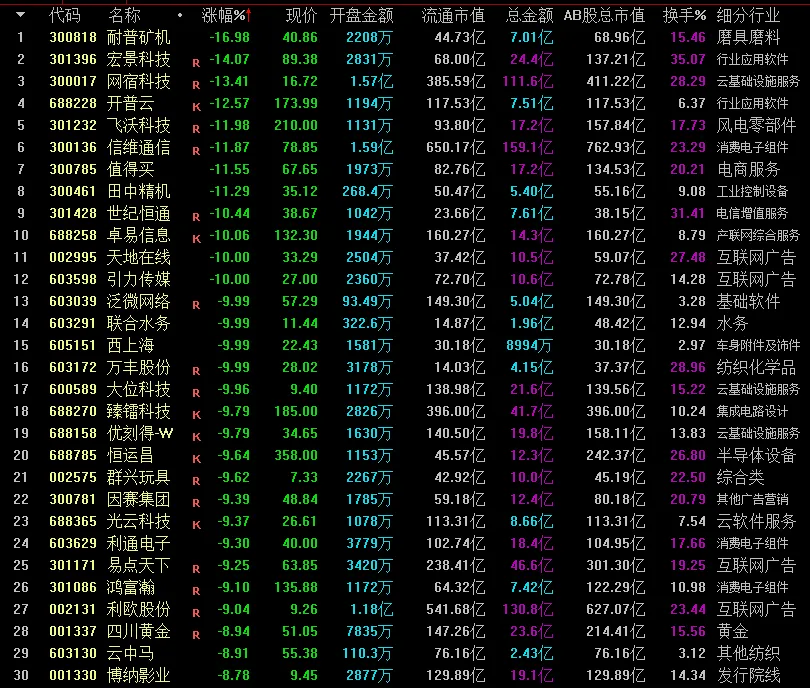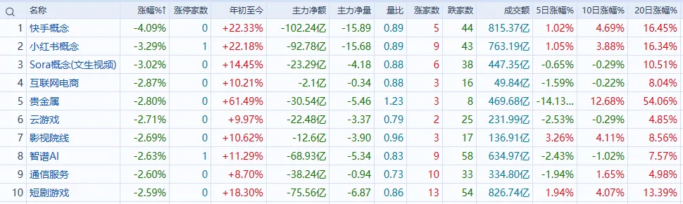 半导体/算力硬件:通信设备、计算机等科技成长板块成为资金流出重灾区,卓易信息、光云科技等跌超9%。
