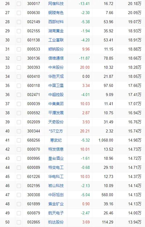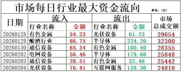 资金净流出前列:互联网服务、通信设备、半导体等净流出排名靠前,其中互联网服务净流出138.30亿元。